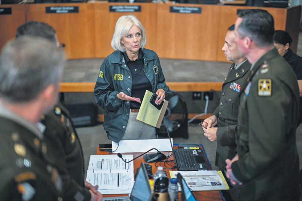 Chairwoman Jennifer Homendy speaks to representatives of the U.S. Army during the third day of the National Transportation Safety Board’s hearings on the Jan. 29 midair collision over the Potomac, at the NTSB boardroom in Washington, Aug. 1, 2025. The NTSB chair warned that a provision in the new defense bill would worsen the risk of midair collisions near the Washington-area airport where a deadly crash in January killed 67 people. (Kenny Holston/The New York Times)