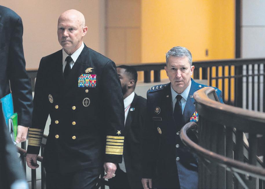 U.S. Navy Admiral Frank “Mitch” Bradley, left, and U.S. Air Force Gen. Dan Caine, the chairman of the Joint Chiefs of Staff, arrive for a closed door classified meeting with lawmakers on Capitol Hill in Washington on Thursday, Dec. 4, 2025. Democratic and Republican lawmakers on Thursday came away with starkly different conclusions after top military officers showed them video of an attack on a boat suspected of carrying drugs, including a follow-up strike that killed two survivors of the first missile. (Tierney L. Cross/ The New York Times)