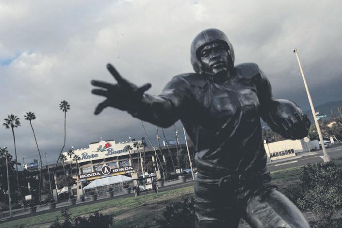 A statue of Jackie Robinson, who played football at Pasadena Junior College, outside the Rose Bowl stadium in Pasadena, Calif., Nov. 18, 2025. The storied stadium is at the center of a battle between Pasadena and UCLA that’s about money, nostalgia, geography and so much more. (Mark Abramson/The New York Times)