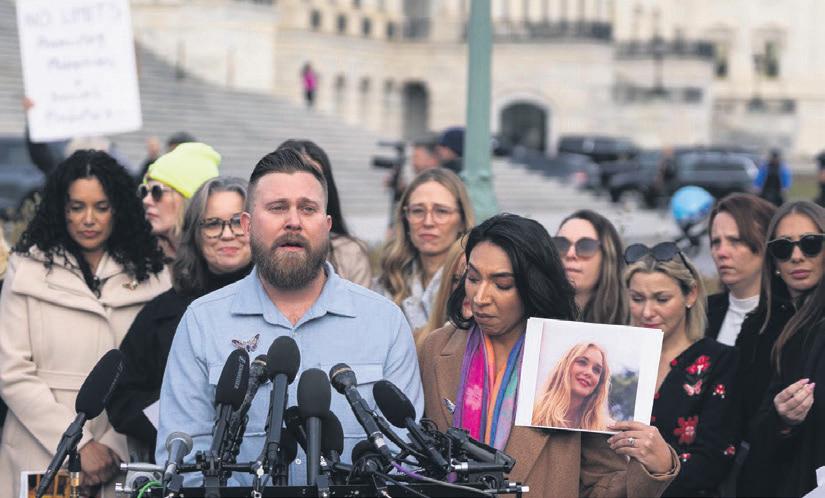 Sky Roberts, brother of Virginia Roberts Giuffre, a victim of Jeffrey Epstein’s sex-trafficking ring, speaks as his wife, Amanda Roberts, holds a photo of Virginia at a news conference on the Epstein Files Transparency Act outside the Capitol in Washington, on Tuesday, Nov. 18, 2025. The House was expected to vote overwhelmingly on Tuesday to demand that the Justice Department release all files related to its investigation into the convicted sex offender Jeffrey Epstein, an action that Republicans worked for months to avoid. (Tierney L. Cross/The New York Times)