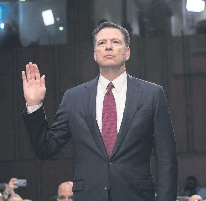 Former FBI Director James Comey is sworn in during a Senate hearing on Capitol Hill in Washington, June 8, 2017. A federal judge threw out the criminal charges against James Comey, the former F.B.I. director, and Letitia James, New York’s attorney general, on Monday after finding that the prosecutor President Trump handpicked to bring the cases had been illegally appointed. (Doug Mills/The New York Times)