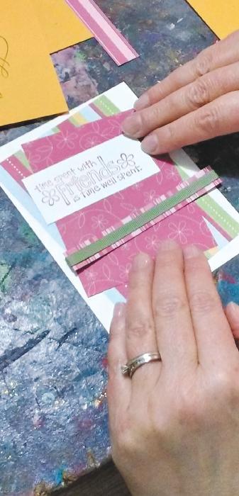 Experimenting with positioning during the card-making session during the women's craft weekend.