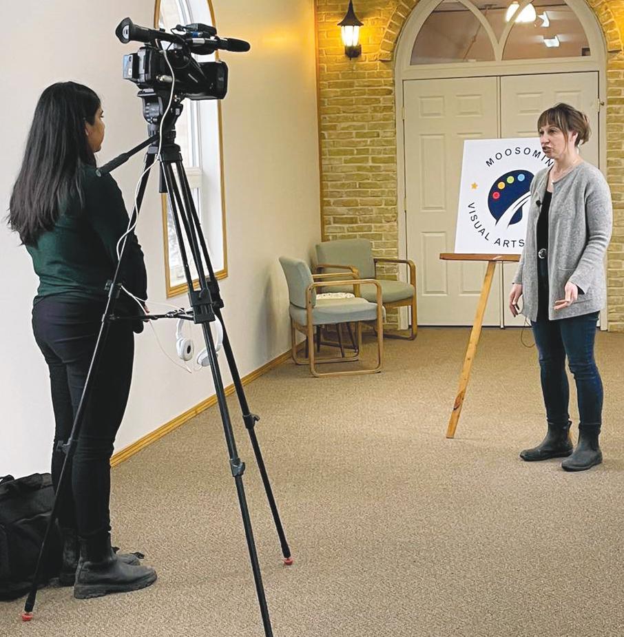 Kara Kinna with the Moosomin Visual Arts Centre (right) speaks to media about the centre moving into St. Alban Anglican Church. Photo courtesy Facebook