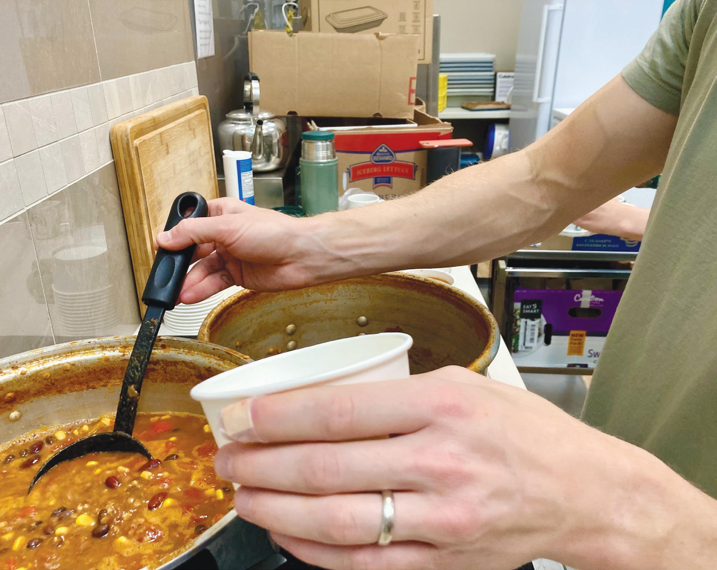 A volunteer prepares chili for the weekend lunch program at St. Aidan.