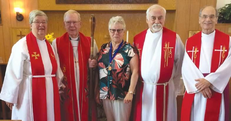 From left, standing beside the crucifer, is the Acting Primate, Archbishop Anne Germond, and the three bishops of Saskatchewan — Helen Kennedy of Qu’Appelle, Rick Reed of Saskatchewan, and Chad McCharles of Saskatoon — who gather at the high altar of the Cathedral of St. John the Evangelist, Saskatoon, after the June 14 service of consecration and instillation of Bishop Chad McCharles as the 14th bishop of the Diocese of Saskatoon.