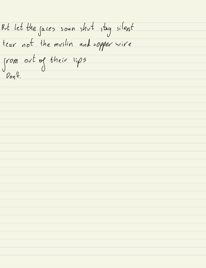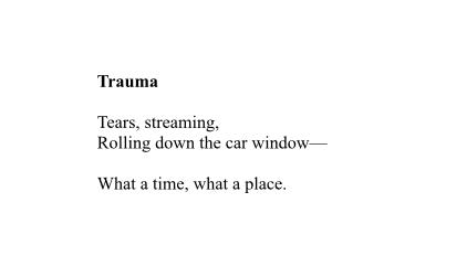 it starts with a torsion and a burst. fifty stabbings by needle, cannula, scalpel. pain relief and anaesthetic turn permeable the membrane between sleep and life. reality sets the stage for the worst and the weirdest of my usual nightmares. i’m naked in class with my muscles untoned, stomach not flat, and organs exposed. i’m too deep in drugged sleep to notice or care. though later, i’ll wonder what snide thoughts the med students shared. i’m watched. on all sides by nurses in day, at night by two fellow patients. both had fallen gravely. before i go under, they watch feet that still have youth carry me where i like. after, i lose my legs too. ten metres’ walking are my lot before my hearing retreats into a vacuum, sound becomes echo, sweat drips, knees buckle. i collapse onto a commode. wheeled back, i glance around long enough to see eyes searching back. i won’t watch if you won’t. i close mine again. the hospital food is quite decent. almost the least believable waking dream. another of my usual nightmares: the dead shall rise and the witnesses shall die. one midnight, a new patient, whose coughs hack through tense quiet already broken by moans. she says she tested negative for a certain flu. as the rest of us start to wretch in the next halfday, our lives are in the hands of her lie or truth. coughs are the third sound added to an older patient’s