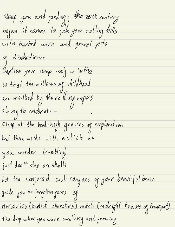 armoury, after sobs and questions. she cannot sleep either, and she knows about as much of herself as i know of her. she refuses a carer. no one comes to visit. i am terrified: dreaming or not, unlike her, i must remember where i am. i see apocalypse in other small ways. while red-and-green leaf prints on tinted windows hide outside views of concrete, they cannot smudge the strobe lights. i cannot float in sleep from the brightness, just as migrant birds cannot seek guidance and so are flightless. the stars in the sky have been switched off, obsolete to the richer half of the human population, mourned by everyone and everything else. without dreams, i cannot revisit my childhood in the Makgadikgadi Pans, where horizon met Milky Way and kissed crystal-clear. my wooziness hinders command of my keyboard. where am- oh, right. sleeping here, i do not dream. but absurdism bends what i see: i must be awake.
