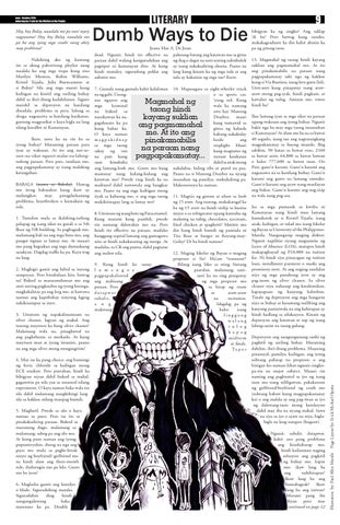 9 bibigyan ka ng singko? Ang saklap ‘di ba? Pero huwag kang susuko, makakagraduate ka din kahit abutin ka pa ng pitong taon. 13. Magmahal ng taong hindi kayang suklian ang pagmamahal mo. At ito ang pinakamabilis na paraan nang pagpapakamatay sabi nga ng kaklase kong si Via Bautista, isang love guru (lol). Unti-unti kang pinapatay nang arawaraw mong pag-iyak, hindi pagkain, at kawalan ng tulog. Aminin mo, totoo hindi ba? Ilan lamang iyan sa mga sikat na paraan upang wakasan ang iyong buhay. Ngunit bakit nga ba may mga taong inuunahan si Kamatayan? At alam mo ba na sa bawat 40 segudo, isang tao ang nagtatangkang magpakamatay sa buong mundo. Ibig sabihin, 90 katao sa bawat oras, 2160 sa bawat araw, 64,800 sa bawat buwan o halos 777,600 sa bawat taon. Oo Pare, gano’n karami. Gano’n karami ang nagsasawa na sa kanilang buhay. Gano’n karami ang gusto na lamang sumuko. Gano’n karami ang ayaw nang masilayan ang bukas. Gano’n karami ang nag-iisip na wala nang pag-asa. Isa sa mga pumasok sa kweba ni Kamatayan nang hindi man lamang kumakatok ay si Kristel Tejada, isang anak, kaibigan, at tulad mo isang Iskolar ng Bayan sa University of the PhilippinesManila. Nangangarap maging doktor. Ngunit napilitin siyang magsumite ng Leave of Absence (LOA), matapos hindi makapagbayad ng P10,000 na tuition fee. Ni hindi siya pinayagan ng tuition loan, installment payment o maski ang promisory note. At ang naging sandalan niya ng mga panahong iyon ay ang pag-inom ng silver cleaner. Sa silver cleaner niya nahanap ang katahimikan, kapayapaan ng kanyang kalooban. Tinalo ng depresyon ang mga hangarin niya sa buhay at kasamang nailibing ang kanyang paniniwala na ang kahirapan ay hindi hadlang sa edukasyon. Kinain ng depresyon ang katawan at isip ng isang labing-anim na taong gulang. Depresyon ang nangungunang sanhi ng pagkitil ng sariling buhay. Maraming dahilan, iba’t-ibang problema. Maaaring pinansyal, pamilya, kaibigan, ang iyong sobrang pahirap na propesor, o ang binigay-ko-naman-lahat-ngunit-singkopa-rin na major subject. Maaari rin naming ang pagbusted sa iyo ng isang taon mo nang nililigawan, pakakaroon ng girlfriend/boyfriend ng crush mo (sobrang babaw kung magpapakamatay ka) o ang malala ay ang pag-iwan sa iyo ng dalawang-taon mong karelasyon dahil may iba na siyang mahal. Sawa na siya sa iyo o ayaw na niya, biglabigla na lang natapos (hugoot). Ngunit, subalit, datapwat, kahit ano pang problema ang kinahaharap mo, hindi kailanman naging solusyon ang pagkitil ng buhay mo. Isipin mo, ikaw lang ba ang nahihirapan? Ikaw lang ba ang bumabagsak? Ikaw lang ba ang iniwan? Marami pang iba diyan pero mas continued on page 12