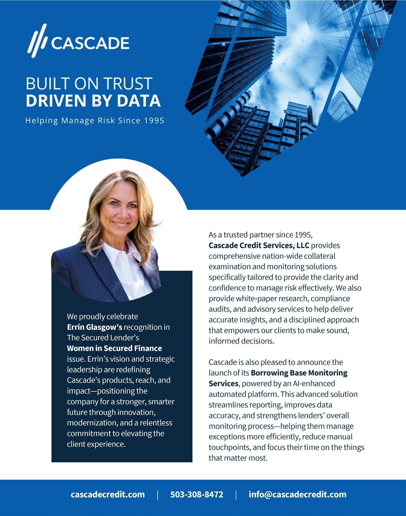 It is a privilege to welcome you to our annual Women in Secured Finance issue of The Secured Lender . Each year, this edition allows us to recognize outstanding women across the secured finance ecosystem. This year, it also highlights something especially timely: the critical role women are playing as the industry navigates greater complexity, heightened risk awareness, and continued change.