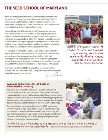 THE SEED SCHOOL OF MARYLAND When our sixth graders move into their new SEED home for the first time, they’re at an exciting milestone in their lives. They’re brimming with potential and eager for opportunities to prove themselves. They’re proud of who they are, but they’re even more excited about what they’re going to become. You could say that SEED Maryland itself has reached a similar phase of development. Our first two classes of graduates have shown us what we’re capable of achieving, and their success in college inspires our students daily. We’ve grown to our full capacity of 400 students, we’ve got eight years of experience to draw upon and learn from, and we’re ready to build on our existing strengths— particularly our vibrant and enthusiastic community. For example, local theatres Center Stage and Everyman Theatre (in partnership with the Maryland State Department of Education) work with our drama program, and our students intern at Baltimore-based organizations (like Johns Hopkins, highlighted below). These partnerships don't just benefit our students; they also imbue SEED Maryland into the fabric of Baltimore and Maryland. That’s one more thing SEED Maryland has in common with its students. We are surrounded by a caring, dedicated community that is deeply invested in our success.