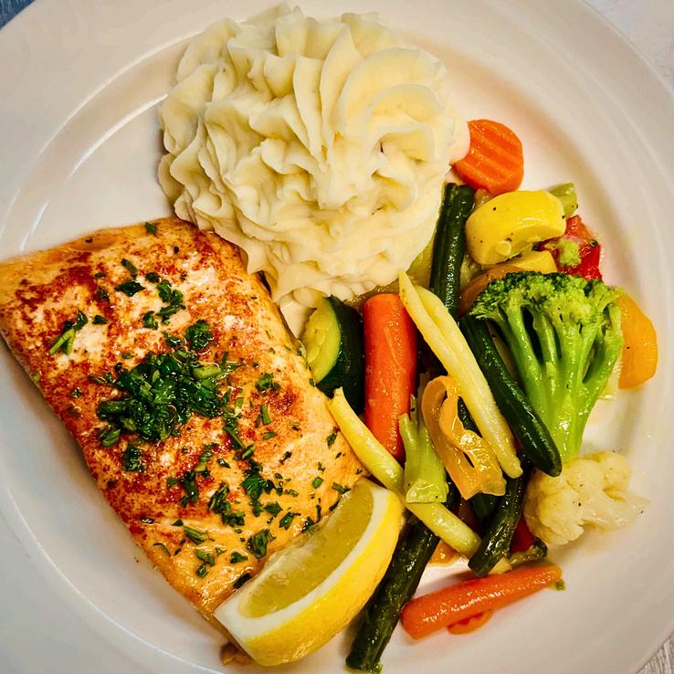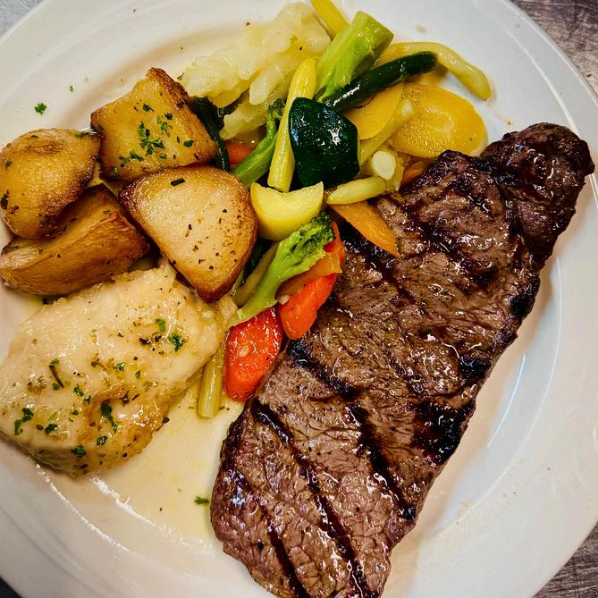 Dinner with 2 Entrees with fresh vegetables and a choice of starch