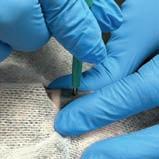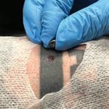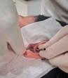2. Brace the skin gently to ensure the O needle sits flat on the skin and enters at 90 degrees – do not pinch the skin so much that it puckers, as this can cause the resulting hole to be a little too big. We do not want to remove tissue unnecessarily. The O needle usually takes the tiny core of skin out with it, but check to see if this has happened. If not, a gentle wipe/pinch with gauze usually does the trick.