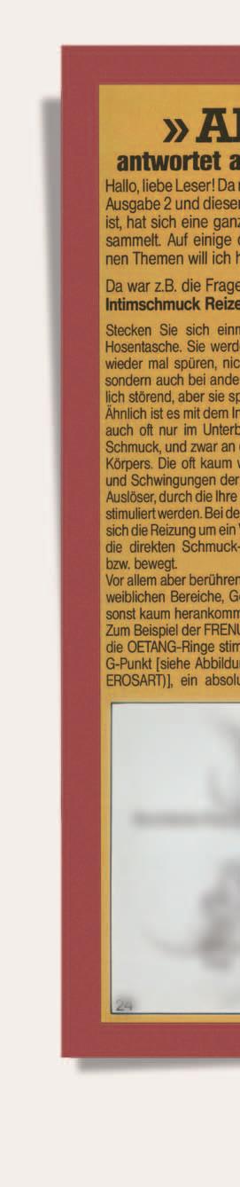 o ther magazines that dealt with the same subject matter, such as PFIQ , had a more serious and technical tone and didn’t always include colour photographs, mainly due to the high cost of printing at the time. These publications certainly laid the groundwork for creating greater access to this information and certainly preceded IntimSchmuck , however the playful and erotic-forward approach to the subject is why I am such a fan of this particular entry into the discourse. A fantastic magazine overall, for enthusiasts and novices alike.
