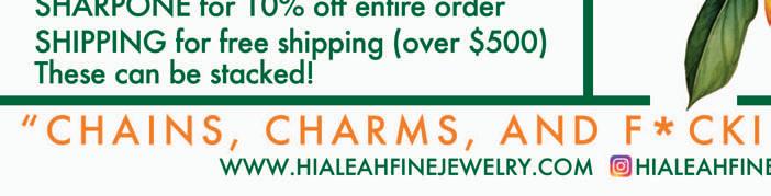 advertisers. A big shout out goes to Piercemed for the super generous free samples sent out with UKbased subscriber copies; to BVlA for the fantastic free gift they’re offering to all readers (see leaflet for details); to Hialeah Fine Jewelry for the discount code (page 11); and to NeoMetal, tish lyon and leroi for spreading the sticker joy. We hope you’ll enjoy these gifts –don’t forget to show these guys some love!