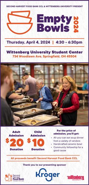 For the past 30 years, Second Harvest Food Bank has partnered with Wittenberg University for the annual Empty Bowls fundraiser. Every year, students from Wittenberg University and Springfield-area high schools hand make over 1,000 ceramic bowls to be sold as event “admission” to the all-you-can-eat soup buffet to help raise money for Second Harvest. The bowls serve as a poignant reminder of the persistent “empty bowls” in the world, a consequence of wide-spread food insecurity.