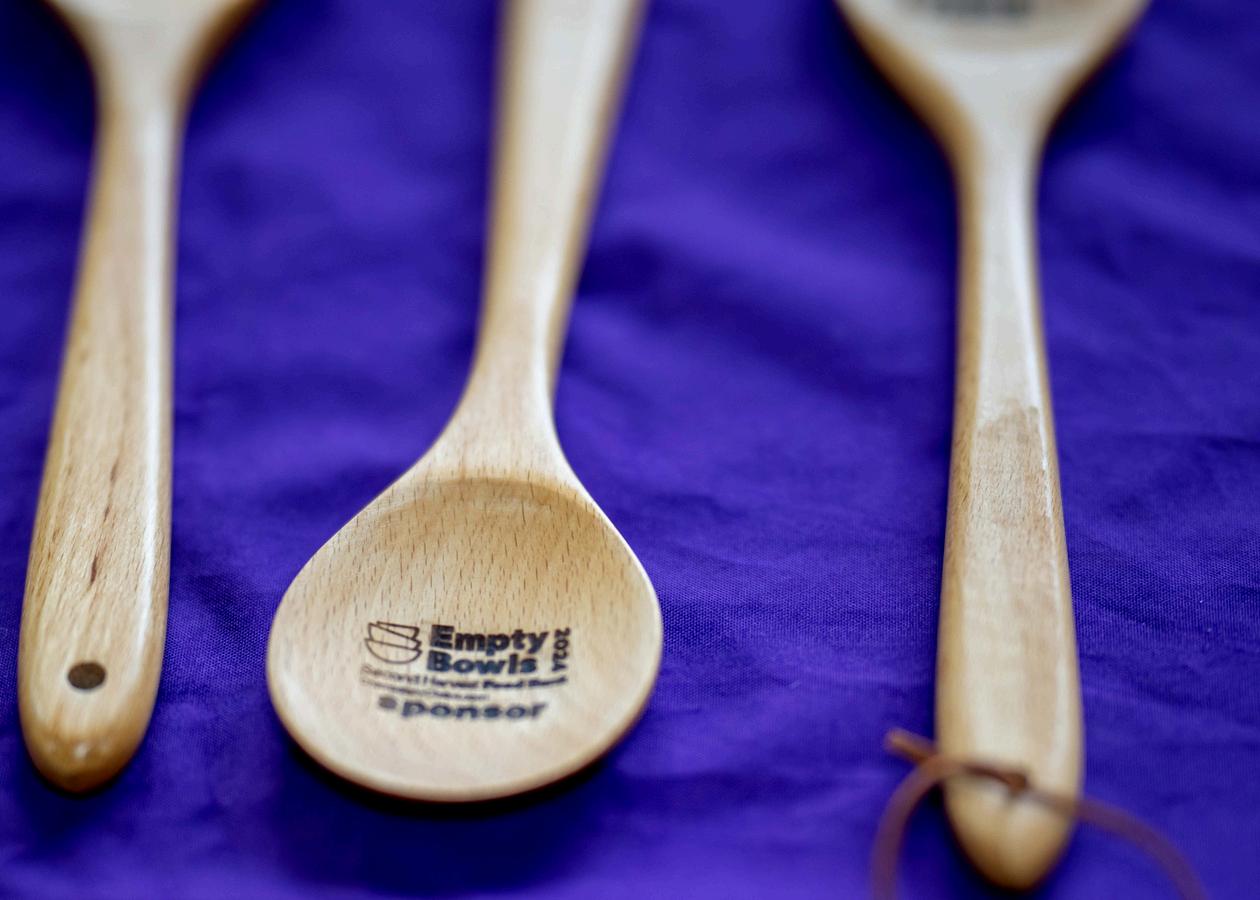 Wooden spoon with engraved 2025 Empty Bowls logo with leather strap for hanging