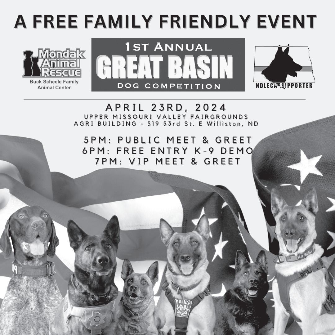 Sinclair, Jonas and Brooks, alongside the NDLECA and Mondak Animal Rescue are excited to bring the Great Basin Dog Competition to Williston and to demonstrate the capabilities of the local K-9 unit teams and how they can be an assent to a community.
