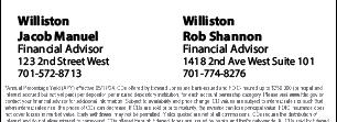 Commercial & Residential - New Construction and Service Drain Cleaning, Hydro-Jetting, Video Pipe Inspection, Home Inspections, Hydronic Heating, Smoke Testing, Septic Systems, Earth Buster, Grease-Trap Cleaning, Farm & Ranch Services, Winterization Casey Moran • License # 1572 • Office: (701) 774-0070 Plumbing - Heating - Air Conditioning Williston Basin Chapter www.ndsonso iberty.com Jeff Wade 701-570-1113 Dennis Nehring 701-609-0869 Look us up on Facebook: ND Sons of Liberty for... Love Our Amendment/ ID/ Limit WatchLower Taxes Open & Border Meetings at the Eagle Ridge Golf Course, 7:00pm | May 20 • June 3 • June 17 “THE TESLA GUY” www.rugbyhomesandrvcenter.com Most competitive prices anywhere Over 35 years servicing your area. 321 Gate Ave. - Williston, ND Williston - 701-776-5878 Like Us on Facebook New & Used Available. Sales Service & Parts On Spot Financing. Come stop and look at our display models. Exclusive Jayco Dealer NEW LOCATION Add your event to the online calendar at www.willistongraphic.com Membership levels for every budget - even free!