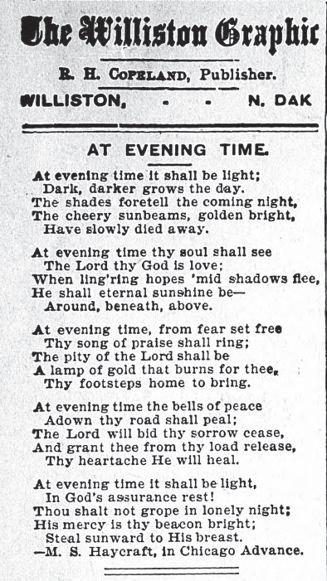 What I have unearthed is that 120 years ago, about the same era as the Wright’s first flight, First Lutheran Church in Williston got its start in a similar reach for the heavens. As one part of a celebration of that coincidence, I have built a 32-foot bulletin board outside the church offices at FLC with the intent of creating a time-line for the church’s history. The first time-marker is the Wright Brothers because their achievement is only two weeks short