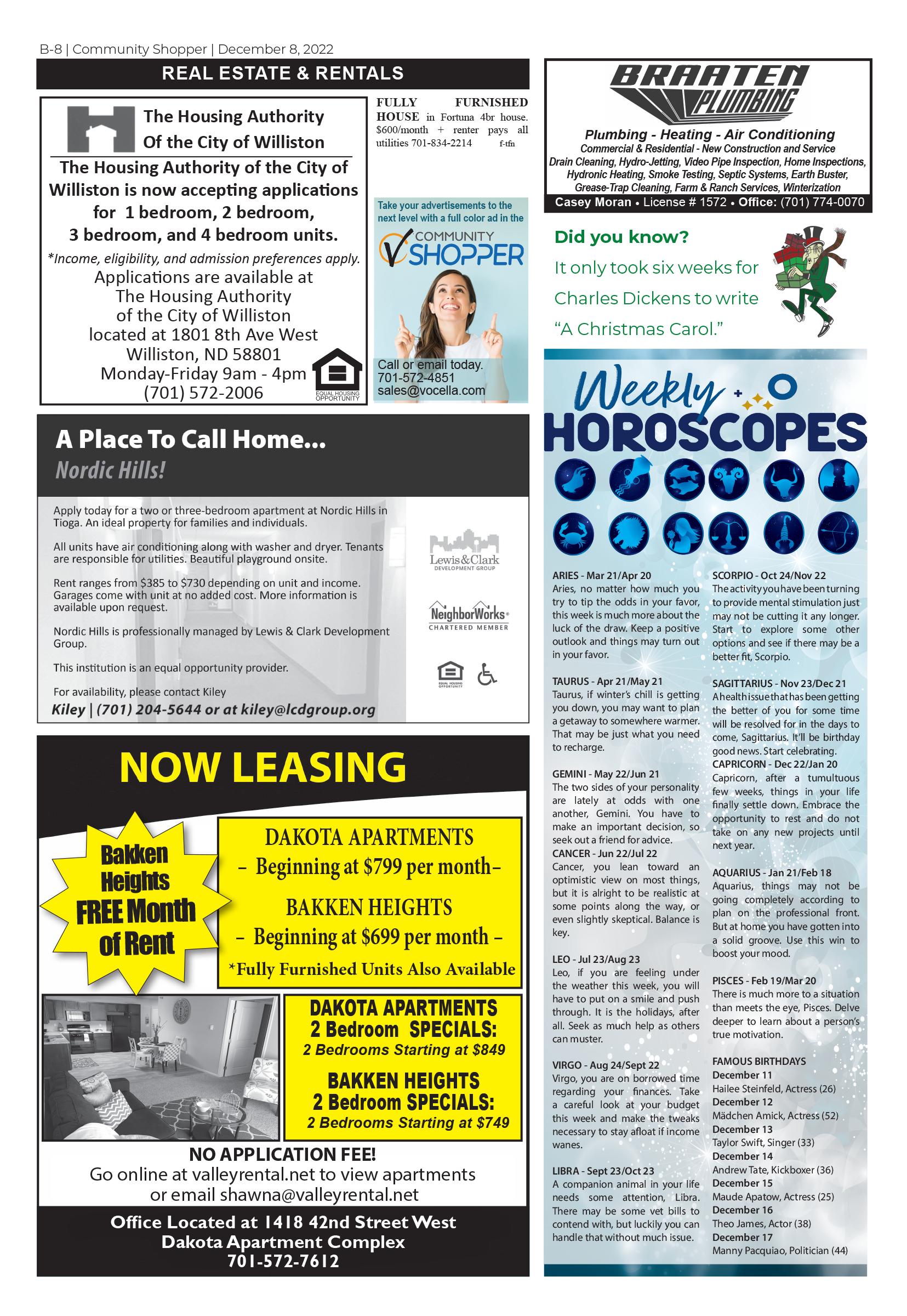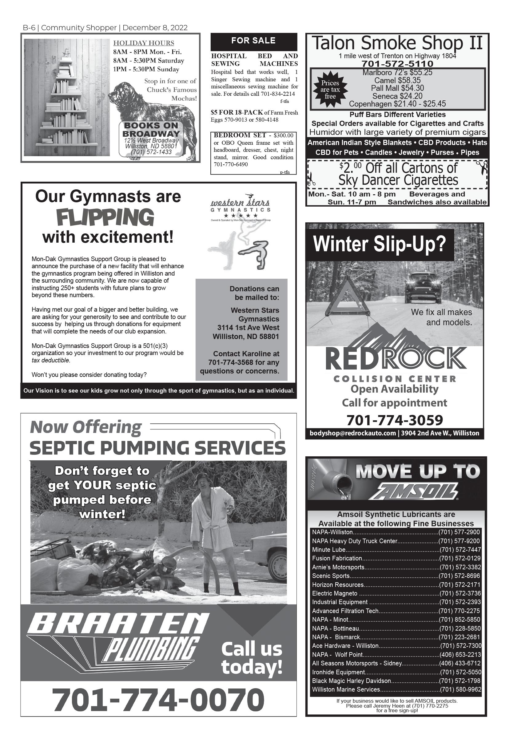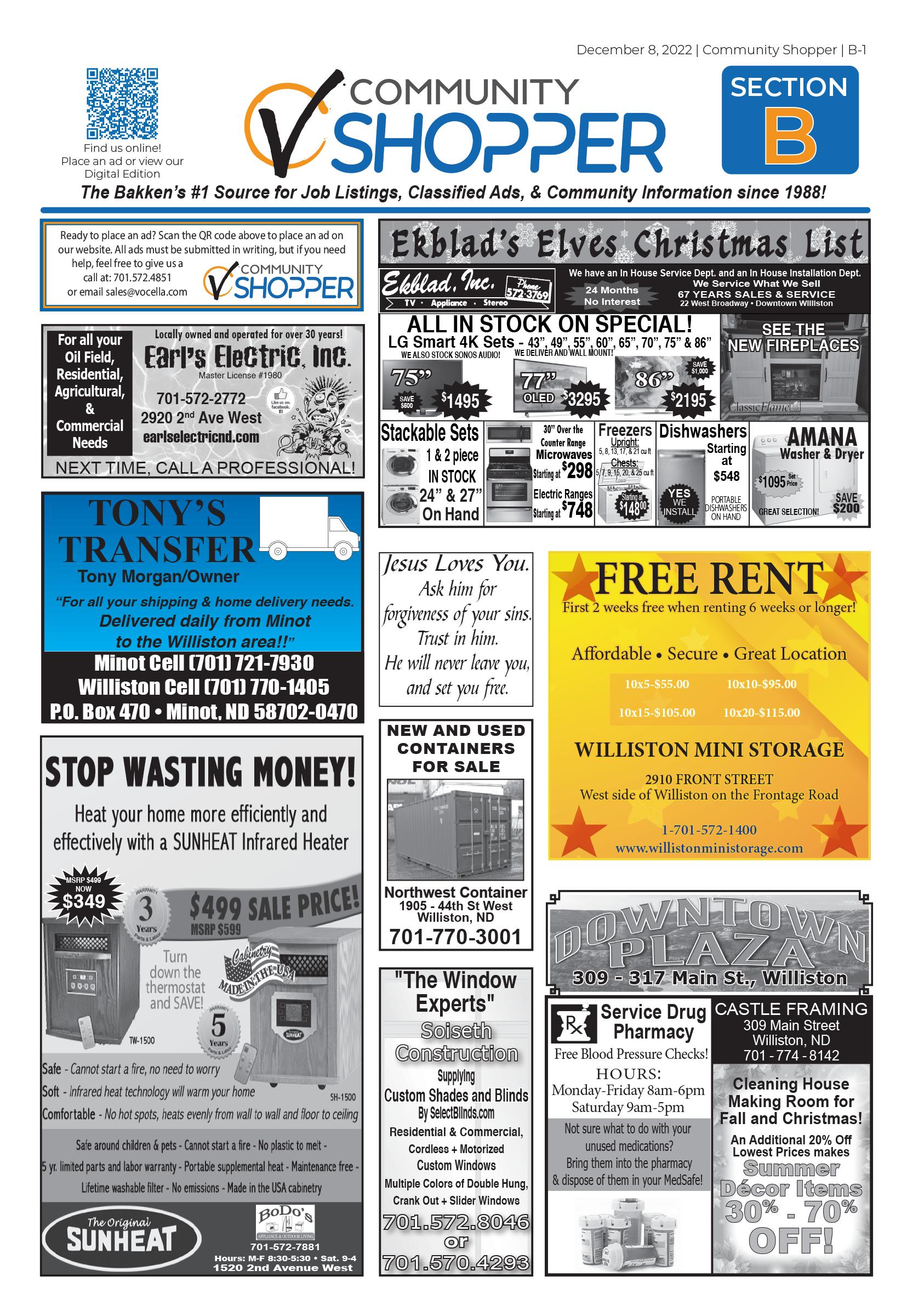 December 8, 2022 edition of the Community Shopper. Williston, North Dakota and surrounding area. Articles include an Artist Spotlight on local Daphne Clark; How the Lights on 2nd Ave came to be a Halloween Tradition; and how the Sensitive Santa event is making a holiday tradition accessible without the sensory overload.