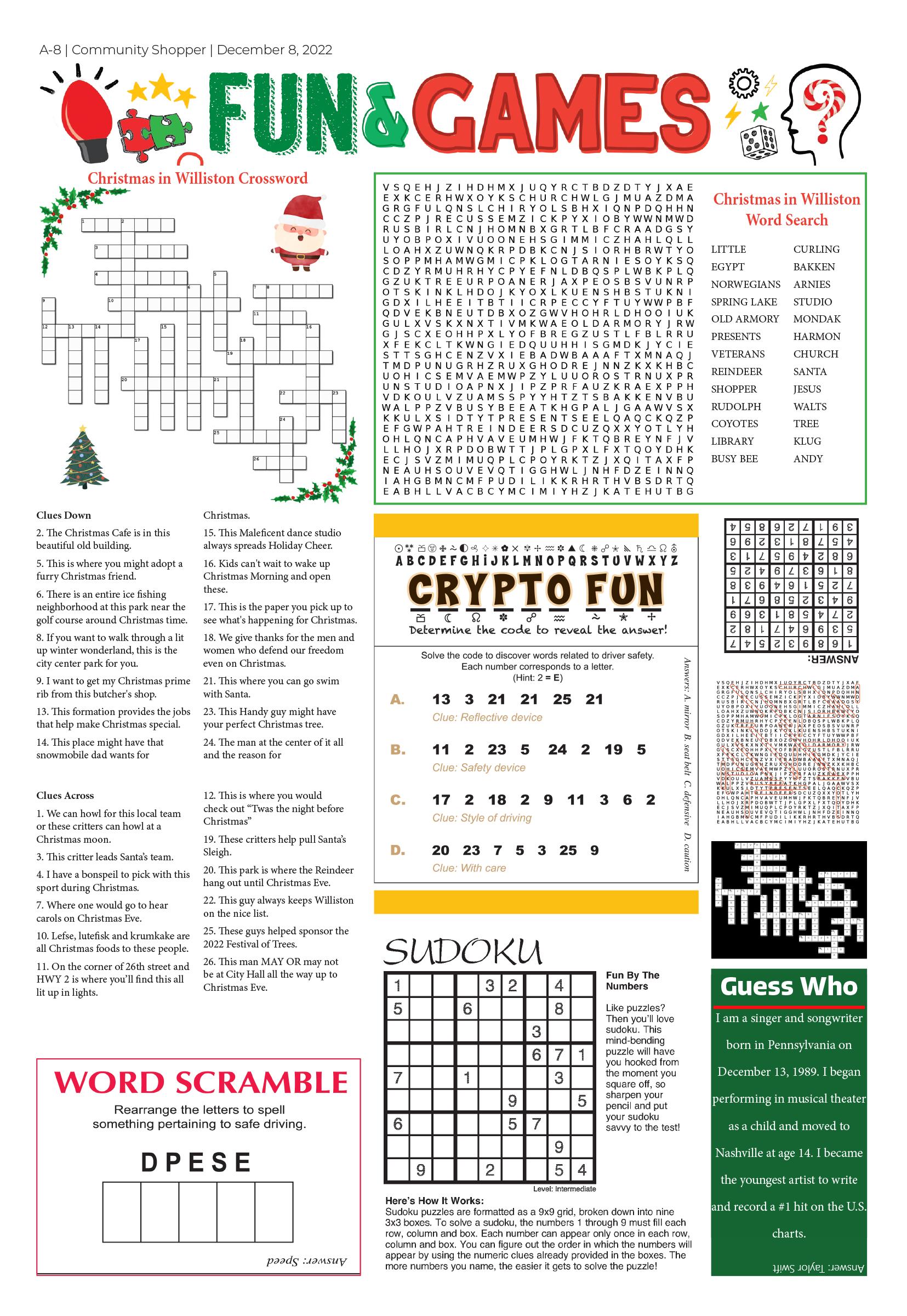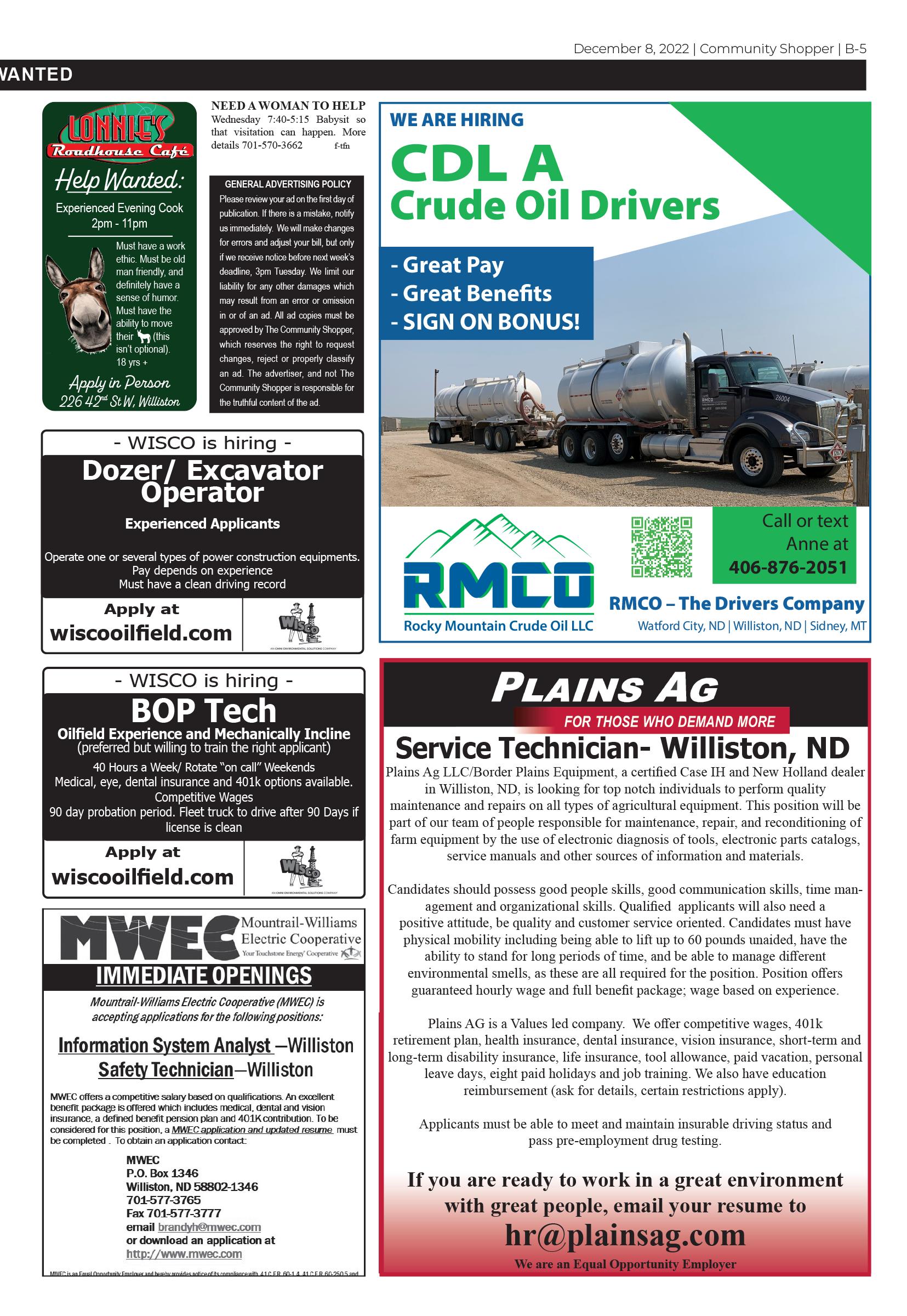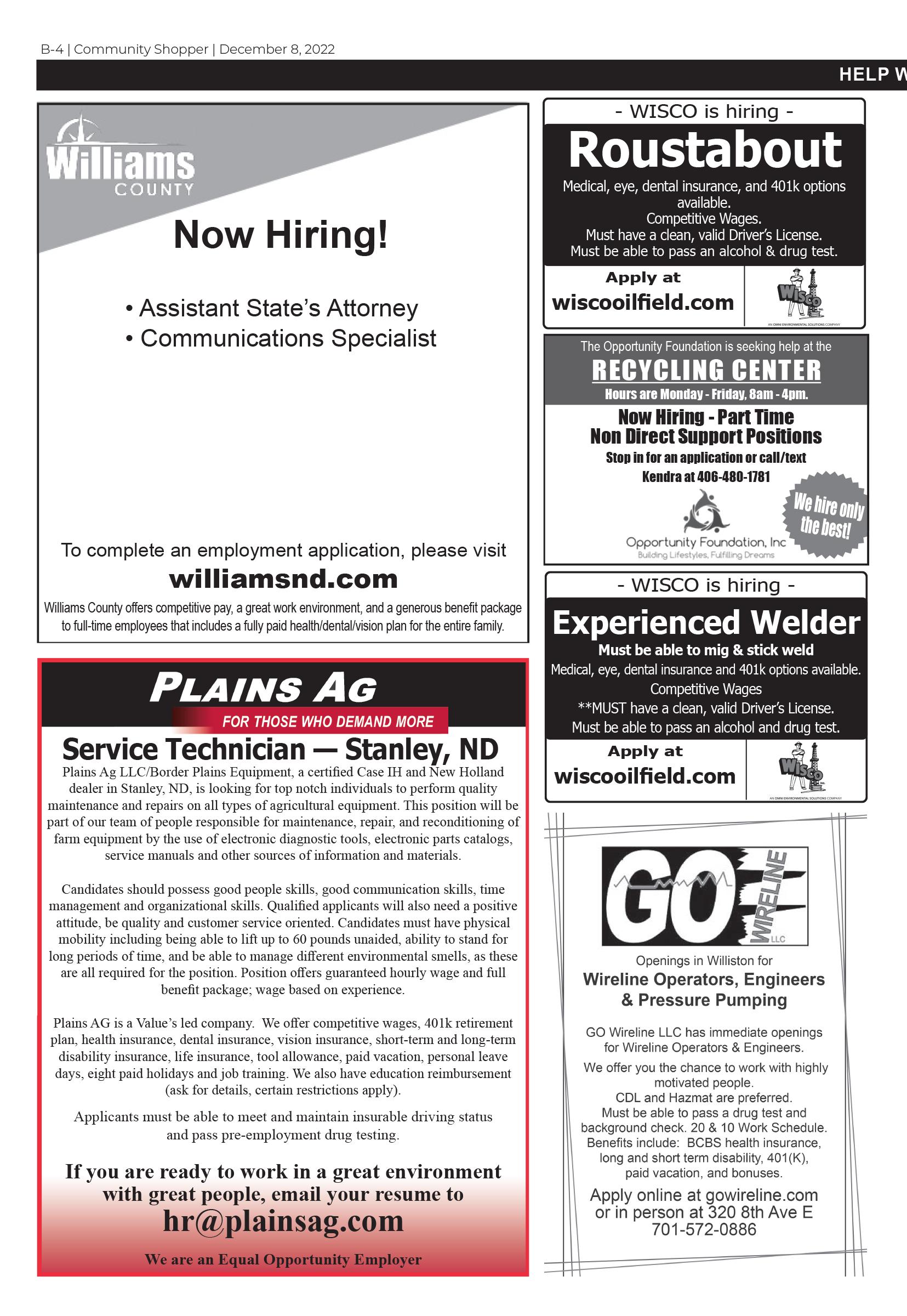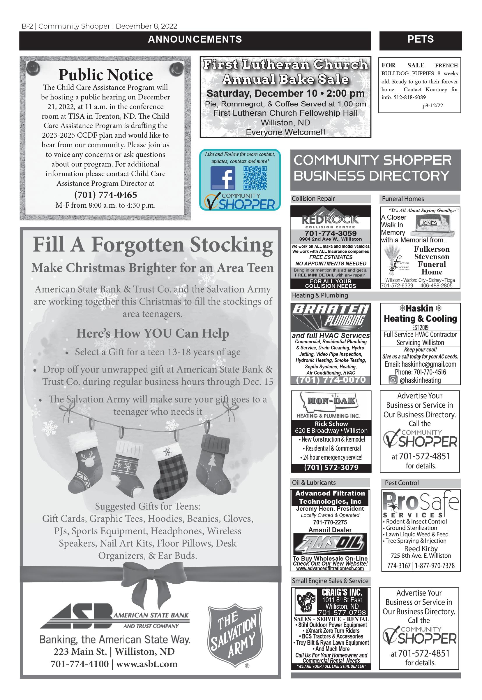 December 8, 2022 edition of the Community Shopper. Williston, North Dakota and surrounding area. Articles include an Artist Spotlight on local Daphne Clark; How the Lights on 2nd Ave came to be a Halloween Tradition; and how the Sensitive Santa event is making a holiday tradition accessible without the sensory overload.
