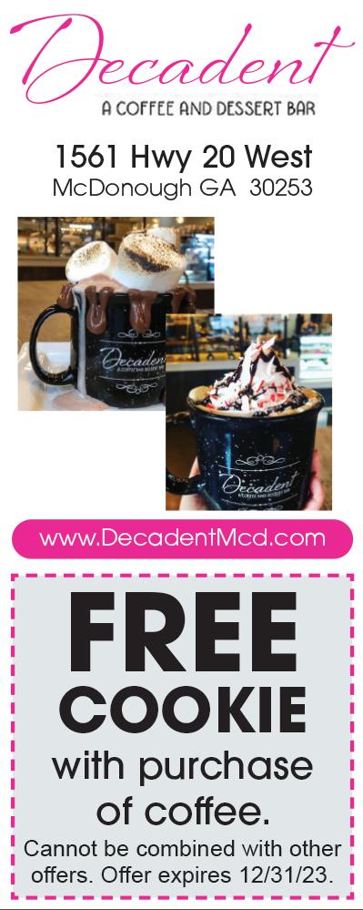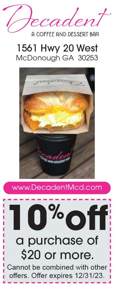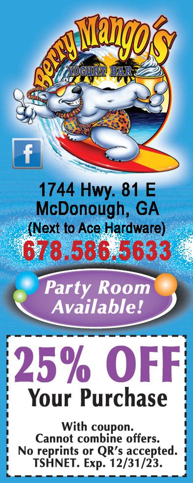 CLIP SUNDAY MONDAY TUESDAY WEDNESDAY THURSDAY FRIDAY SATUR DAY 3 4 5 6 7 8 9 10 11 12 13 14 15 16 17 18 19 20 21 22 23 24/31 25 26 27 28 29 30 1 2 HC25 DECEMBER Kiwanis – 12:00pm - 1:00pm Golden Corral McDonough Kiwanis – 12:00pm - 1:00pm Golden Corral McDonough Kiwanis – 12:00pm - 1:00pm Golden Corral McDonough Henry County Schools Semester Break – December 21st - January 5th Schools Early Release Day Henry County Schools Semester Break – December 21st - January 5th World AIDS Day National Mutt Day International Volunteer Day National Guard Birthday Bill of Rights Day Hanukkah Begins National Cookie Exchange Day Christmas Day First Day of Kwanzaa Christmas Eve (24th) New Year’s Eve (31st) Gingerbread House Day National Bacon Day Winter Solstice National Ugly Sweater Day Pearl Harbor Remembrance Day Christmas Card Day National Brownie Day City of Hampton - Hampton Christmas Parade | Downtown Hampton Good toward food and beverage purchases (excluding alcohol). Coupon must be presented at time of order. One coupon per party per visit. Not valid with any other discount offers. Offer expires 12/31/22. BUY ONE ENTREE, GET ANOTHER ENTREE OF EQUAL OR LESSER VALUE 938 Eagles Landing Parkway Stockbridge, GA 30281 770.507.4827 theitalianoven.com 5 East Main St. Hampton, Georgia (678) 782-6066 MUST PRESENT COUPON WHEN ORDERING. Dine-In & Dinner Only. With this certificate. Not valid on holidays. Cannot be combined with other offers. No Mobile Coupons. Alcohol Excluded. One coupon per table. Expires 12/31/23. 50% OFF Sushi Roll When you purchase Second Sushi Roll of Equal or Lesser Value Tempura • Teriyaki Fusion Style Entrees Sushi • Hibachi Filet Mignon • Lobster A Henry County dump site 1940 GA-42 McDonough, GA 30252 470-488-0084 www.HenryWaste.com 15% OFF BRING THIS AD FOR ANY LOAD Located in the Kroger Center on Hudson Bridge Road Tuesday-Saturday 10AM-5PM Closed on Sunday and Monday WWW.AFANCYTHATJEWELRY.COM 770-507-7458 Fancy That Fancy That Fine Jewelry LAURA HARLAN LICENSED REALTOR 404-310-6035 Laura Harlan Real Estate LauraHarlanRealEstate@gmail.com https://HARLANLAURA.georgiamls.com LauraHarlan.MarketSouthPropertiesInc.com Visits with Santa and Christmas activities! SouthernBelleFarm.com Christmas On The Farm Geranium Drop (31st) McDonough Square City of McDonough Santa on The Square from 11am-4pm City of McDonough Santa on The Square from 11am-4pm McDonough Christmas Parade 6pm Locust Grove Christmas Parade 10am ATLCHIMNEY.COM Atlchimney@gmail.com CALL NOW! 678-788-0050 Cannot be combined with other offers. Offer expires 12/31/23 CLEANING & SAFETY INSPECTION $169