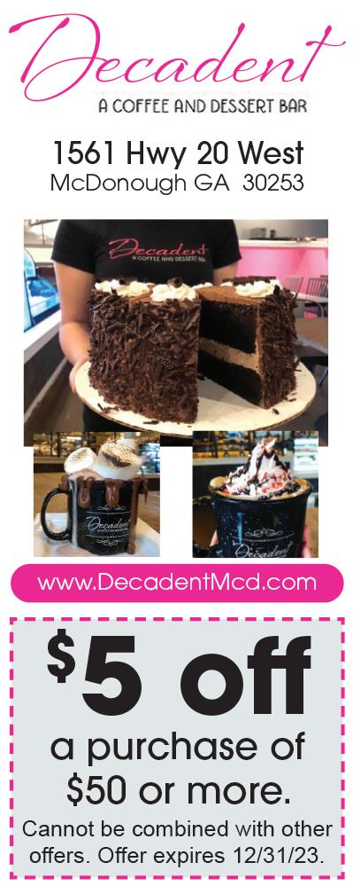 Serving Breakfast, Lunch & Dinner Mon-Sat 7am-6:30pm Sunday 8am-3pm FREE TEA With Purchase of Lunch or Dinner Entrée Dine-in Only. Cannot be Combined. Limit 1 Per Person. Expires 12/31/23. Most Vehicles -10w30 or 5w30 up to 5 Qts. With coupon. Not valid with any other offers. Exp. 12/31/23. $2995 FULL SERVICE OIL CHANGE Gourmet Chocolate Shoppe SweetS for every occaSion & corporate orderS Any Purchase of $50 or More *MuSt preSent coupon. one coupon per perSon per viSit. cannot be coMbined with other offerS or SpecialS expireS 12/31/23 218 John Frank Ward Blvd McDonough, GA Inside Thompson Market 770-282-4080 Call or Text $10 Off $10 Off Featuring… • Jeni’s Ice cream • Nightingale • Hershey’s • Mini melts & much more! $25 off Any booking of $250 or more Offer expires 12/31/23 tezzypoohicecreamtruck.com TezzyPoohIceCream@gmail.com 470-710-9355 218 John Frank Ward Blvd. McDonough, Georgia 30253 (770) 957-3383 Closed Sun & Mon Tues-Fri 10 AM - 6 PM Sat 10AM-3PM ONE FREE TOMATO No purchase necessary. Cannot combine coupons. $5 Off Any Purchase of $40 or More Cannot be Combined With Other Offers. Limit 1 Per Person. Expires 12/31/23. CLIP HC27 Serving Breakfast, Lunch & Dinner Mon-Sat 7am-6:30pm Sunday 8am-3pm FREE Slice of Pecan Pie With Purchase of Dinner Entrée (5pm - 8pm Only) Dine-in Only. Cannot be Combined. Limit 1 Per Person. Expires 12/31/23. With coupon. Not valid with any other offers. Most vehicles. Exp. 12/31/23. $10 OFF ANY SYNTHETIC OIL CHANGE Gourmet Chocolate Shoppe SweetS for every occaSion & corporate orderS Any Purchase of $50 or More *MuSt preSent coupon. one coupon per perSon per viSit. cannot be coMbined with other offerS or SpecialS expireS 12/31/23 218 John Frank Ward Blvd McDonough, GA Inside Thompson Market 770-282-4080 Call or Text $10 Off $10 Off Featuring… • Jeni’s Ice cream • Nightingale • Hershey’s • Mini melts & much more! FREE Ice cream cake with any birthday party booking! Offer expires 12/31/23 tezzypoohicecreamtruck.com TezzyPoohIceCream@gmail.com 470-710-9355 218 John Frank Ward Blvd. McDonough, Georgia 30253 (770) 957-3383 Closed Sun & Mon Tues-Fri 10 AM - 6 PM Sat 10AM-3PM ONE FREE TOMATO No purchase necessary. Cannot combine coupons. FREE Jello Shot With Daiquiri Purchase (Regular or Large) Cannot be Combined With Other Offers. Limit 1 Per Person. Expires 12/31/23. CLIP Serving Breakfast, Lunch & Dinner Mon-Sat 7am-6:30pm Sunday 8am-3pm FREE COFFEE With Purchase of Breakfast Entrée Dine-in Only. Cannot be Combined. Limit 1 Per Person. Expires 12/31/23. With coupon. Not valid with any other offers. Most vehicles. Exp. 12/31/23. $50 Reg. Price $70.00 WHEEL ALIGNMENTS Gourmet Chocolate Shoppe SweetS for every occaSion & corporate orderS Any Purchase of $50 or More *MuSt preSent coupon. one coupon per perSon per viSit. cannot be coMbined with other offerS or SpecialS expireS 12/31/23 218 John Frank Ward Blvd McDonough, GA Inside Thompson Market 770-282-4080 Call or Text $10 Off $10 Off Featuring… • Jeni’s Ice cream • Nightingale • Hershey’s • Mini melts & much more! Fundraiser receives 15% donation of total sales for your event (Schools, churches, non profits) Offer expires 12/31/23 tezzypoohicecreamtruck.com TezzyPoohIceCream@gmail.com 470-710-9355 218 John Frank Ward Blvd. McDonough, Georgia 30253 (770) 957-3383 Closed Sun & Mon Tues-Fri 10 AM - 6 PM Sat 10AM-3PM ONE FREE TOMATO No purchase necessary. Cannot combine coupons. $2 Off Daiquiri Pitcher (Regular Flavors) Cannot be Combined With Other Offers. Limit 1 Per Person. Expires 12/31/23. CLIP