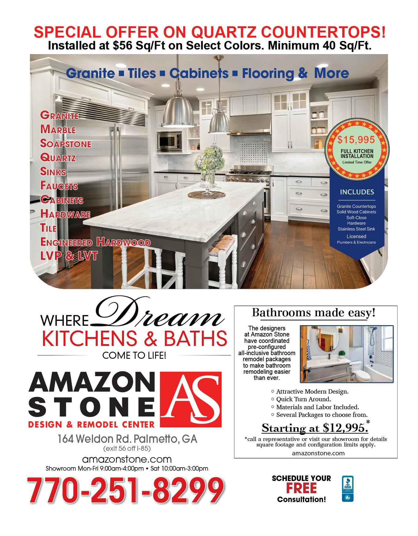 We have the tools and the time to handle those projects you’ve No job is too big or too small. Frameless Glass Shower Doors Also Decks • Wood Floors • Tile Floors 4 Plumbing 4 Electrical 4 Roofing 4 Tile Deluxe Model ELLA WALK-IN TUBS OFFERS INDEPENDENCE SO THAT YOU CAN STAY IN YOUR HOME WITH COMFORT AND CONFIDENCE, WITH MORE FEATURES AND LESS COST THAN ANY OTHER WALK-IN TUB. Why Pay More... when you can get better for less! MAKING YOUR DREAMS A REALITY Providing such products as: Cambria Quartz • Artisan Granite Saratoga Soapstone • Heritage Wood • Natural Stone Granite, Marble, Travertine • Quartz Call Us Today 678-628-6153