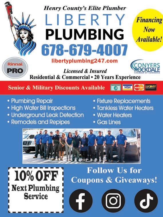 Serving Atlanta for Over 60 Years FULLY INSURED! Call For A Quick & Complete Estimate! Office: 404-627-6909 | Cell: 404-787-7001 or 678-372-7683 www.a1roof-remodeling.com FREE HAIL OR STORM DAMAGE ESTIMATES AVAILABLE • Roof Repairs • Modified rubber roofs • Metal Roofs • All siding/gutters • Painting/Windows • Kitchen/Bathroom/Basement Finishes/Decks PUT OUR TEAM TO WORK FOR YOU! ALL YOUR REMODELING NEEDS OR HOME REPAIRS Tristan Jarrett 470.304.4261 Blake Lackey 678.699.9930 JarrettLandscaping2004@gmail.com Serving Henry County and surrounding areas. CALL OR TEXT: Installations, Repairs, Routine and Preventative Maintenance of All Major Brands! 770-914-1031 Over 16 years of service to people throughout the Southern Metro Area Call Today For A Free Estimate! Locally Owned and Operated Financing Available SOME SUPERHEROES DON’T HAVE CAPES… THEY ARE CALLED DAD! TUNE-UP SPECIAL FIRST UNIT $69.00 EACH ADD’L UNIT ONLY $39.00 Cannot be combined with other offers. Coupon Expires 7/31/24. Cannot be combined with other offers. Coupon Expires 7/31/24. $200 OFF AIR CONDITIONING SYSTEM REPLACEMENT 678-538-7691 Holly’s Clean Sweep Residential Interior Cleaning Call or text today for a free quote! Licensed • Insured • Locally Owned & Operated DEBIT jeffwhisnantplumbing@gmail.com • Water Heater Replacement • Sewer & Drain Service • Water Line Replacement • Handicap Fixtures Installed • All Types Repairs & New Installations 770.616.5523 Senior & Military Discounts Available TRASH AWAY is your alternative to large, corporate sanitation companies! We are locally owned and operated, as well as lifetime residents of Henry County. CALL US TODAY TO RECEIVE FIRST MONTH FREE 770-668-4871 #MAKE THE SWITCH Fix your family’s sanitation situation and make the switch today!