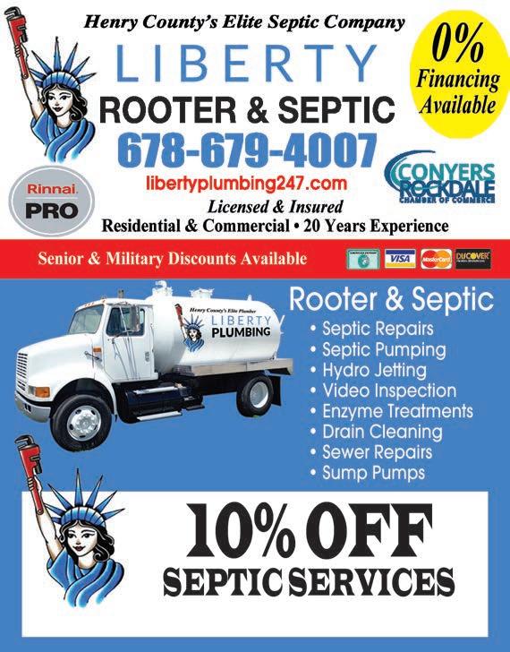 Extra Magazines can be picked up at the McDonough Welcome Center Home Ser vices 29 STOPPED UP? CALL US! Call Bill Elliott III 770-898-3761 www.elliotsseptictank.com • Septic Tanks & Grease Traps Pumped • Tees/Filters/Lid Replacements • Fieldline & Pump Replacements • Inspection Letters • Video Camera Inspections • Alternate Systems/Lift Stations • Septic Tank & Fieldline Treatments SENIOR’S DISCOUNT Elliott's Septic Tank & Grease Trap Service, Inc $15 OFF SEPTIC PUMPING FEE Must present this ad. Cannot be combined with other offers. Offer expires 8/31/23. RESIDENTIAL • COMMERCIAL • INDUSTRIAL Licensed • Bonded • Insured SERVING SINCE 1952 WE’RE #1 IN THE #2 BUSINESS!! 7 DAYS A WEEK EMERGENCY SERVICEHOLIDAYS INCLUDED Happy