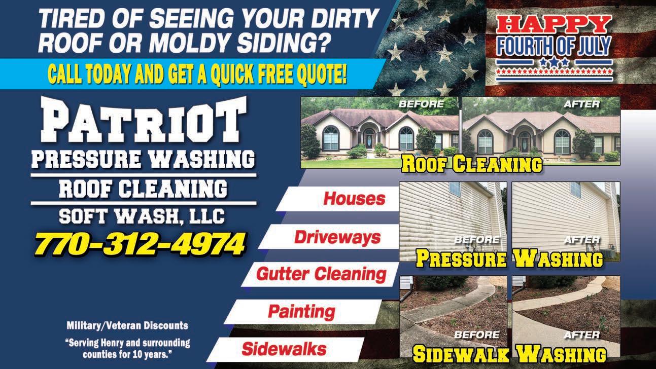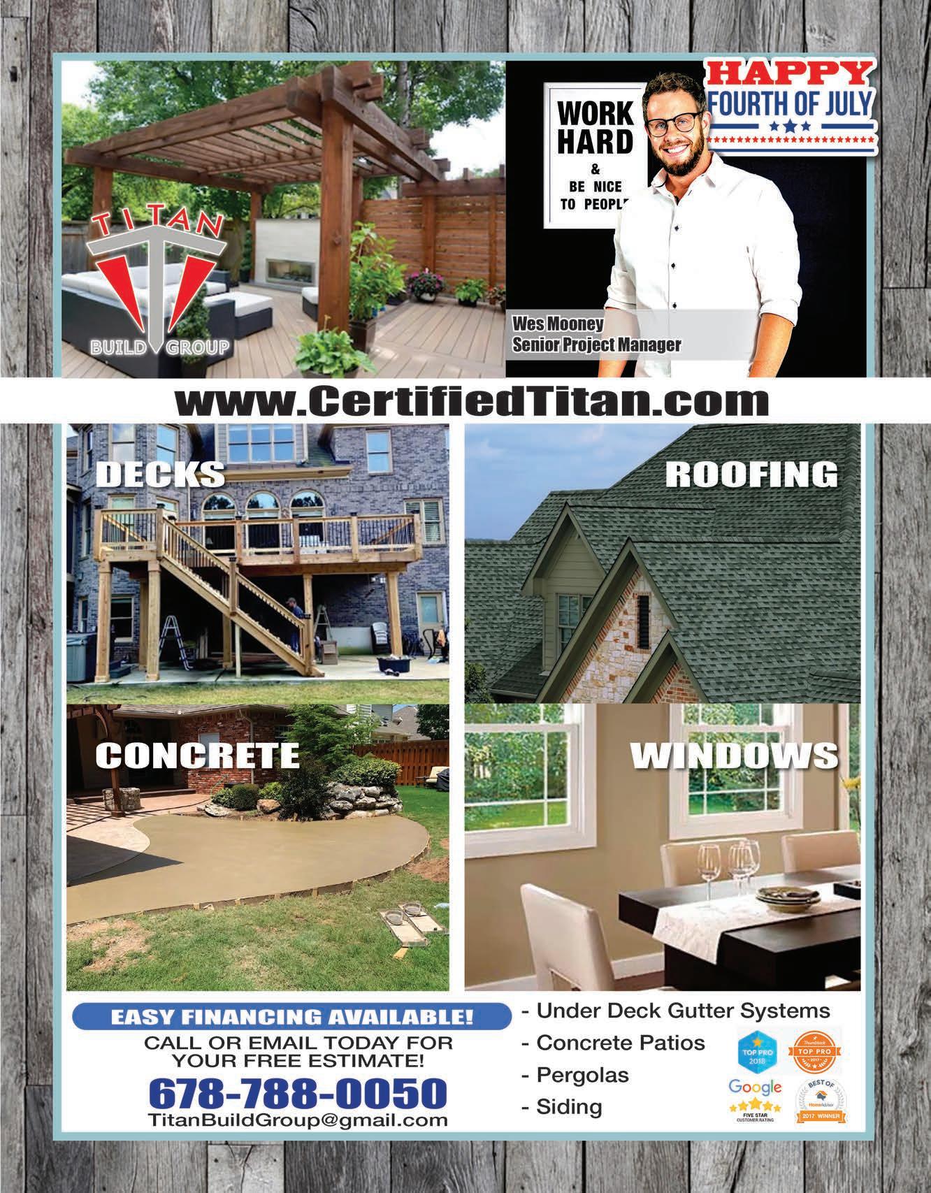 Extra Magazines can be picked up at the McDonough Welcome Center Home Ser vices 53 SUPERIOR EQUIPMENT 10 Gal. PM Soft Wash + 4500PSI Hard = ZERO Competition SOFTWASH & EXTERIOR CLEANING SPECIALISTS BEFORE • HOUSE WASH • ROOF WASH • POWER WASHED DRIVEWAYS • DECKS / FENCES • FENCE STAINING/ PAINTING A DIVISION OF BUILD GROUP 10% OFF ANY SERVICE OVER $300 Must present Coupon at the time of purchase. Some restrictions apply. Cannot be combined with other discounted offers. Exp 8/31/23. AFTER RESIDENTIAL • COMMERCIAL $2M GCL INSURANCE POLICY 470-808-7919 titanbuildgroup@gmail.com 470-808-7919 titanbuildgroup@gmail.com HAPPY 4TH OF JULY!