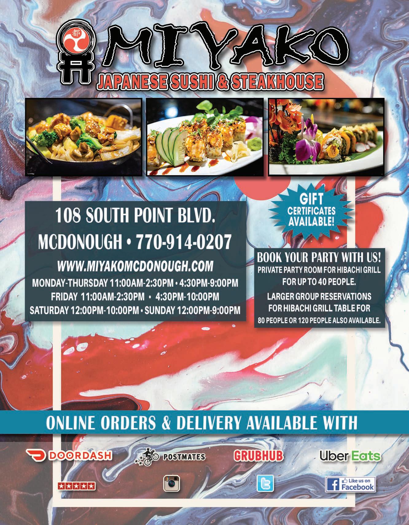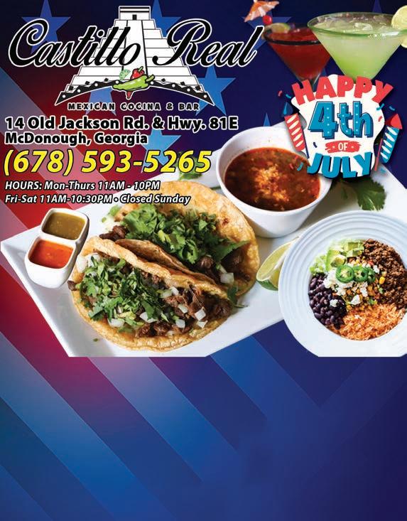 Extra Magazines can be picked up at the McDonough Welcome Center Food & Dining 7 $5 OFF Your total purchase of $30 or more Cannot be combined with other offers. Offer Expires 8/31/23. AUTHENTIC & DELICIOUS THAI CUISINE Pad Thai with Shrimp Open For: LUNCH & DINNER HIGHLY EXPERIENCED CHEFS AND BAKERS! Large Variety of Entrees & Desserts Freshly Prepared To Order. Cheesecake Shrimp Roll Thai Custard with Sticky Rice Lart Nar Steamed Dumpling Thai Cashew Chicken Sesame Chicken Potak Seafood Soup Sticky Rice Mango Basil Duck Orange Chicken Curry Puff Grilled Salmon Grilled Salmon Mon-Thurs: Lunch: 11am-3pm. • Dinner: 4:30pm-9pm Fri.: Lunch: 11am-3pm • Dinner: 4:30pm-10pm Sat.: Lunch & Dinner 12pm-10pm Sun.: Lunch: 12pm-3pm • Dinner: 4:30pm-9pm 622 Eagles Landing Parkway Stockbridge, GA 30281 770.507.8887 www.InseeThaiOfficial.com Red Snapper w/Three Flavours Sauce Dining Room OPEN Everyday 12 Noon-8:00pm Drive Thru OPEN Everyday 10:30am-9:00pm With this coupon. Cannot be combined with other offers or discounts. One coupon per customer per visit. Offer only good at 520 Hwy 81 E in McDonough, GA. Expires 8/31/23 $1 OFF ANY SIZE BLIZZARD With this coupon. Cannot be combined with other offers or discounts. One coupon per customer per visit. Offer only good at 520 Hwy 81 E in McDonough, GA. Expires 8/31/23 $2 OFF ANY COMBO #1-#10 With this coupon. Cannot be combined with other offers or discounts. One coupon per customer per visit. Offer only good at 520 Hwy 81 E in McDonough, GA. Expires 8/31/23 $2 OFF A 4 OR 6 PC CHICKEN STRIP BASKET WITH DRINK PURCHASE With this coupon. Cannot be combined with other offers or discounts. One coupon per customer per visit. Offer only good at 520 Hwy 81 E in McDonough, GA. Expires 8/31/23 $1 OFF ANY TREAT PURCHASE With this coupon. Cannot be combined with other offers or discounts. One coupon per customer per visit. Offer only good at 520 Hwy 81 E in McDonough, GA. Expires 8/31/23 $2 OFF SMALL SHAKE With this coupon. Cannot be combined with other offers or discounts. One coupon per customer per visit. Offer only good at 520 Hwy 81 E in McDonough, GA. Expires 8/31/23 $2 OFF FISH SANDWHICH COMBO 520 HIGHWAY 81 E MCDONOUGH, GA WITH PURCHASE OF ANY BURGER