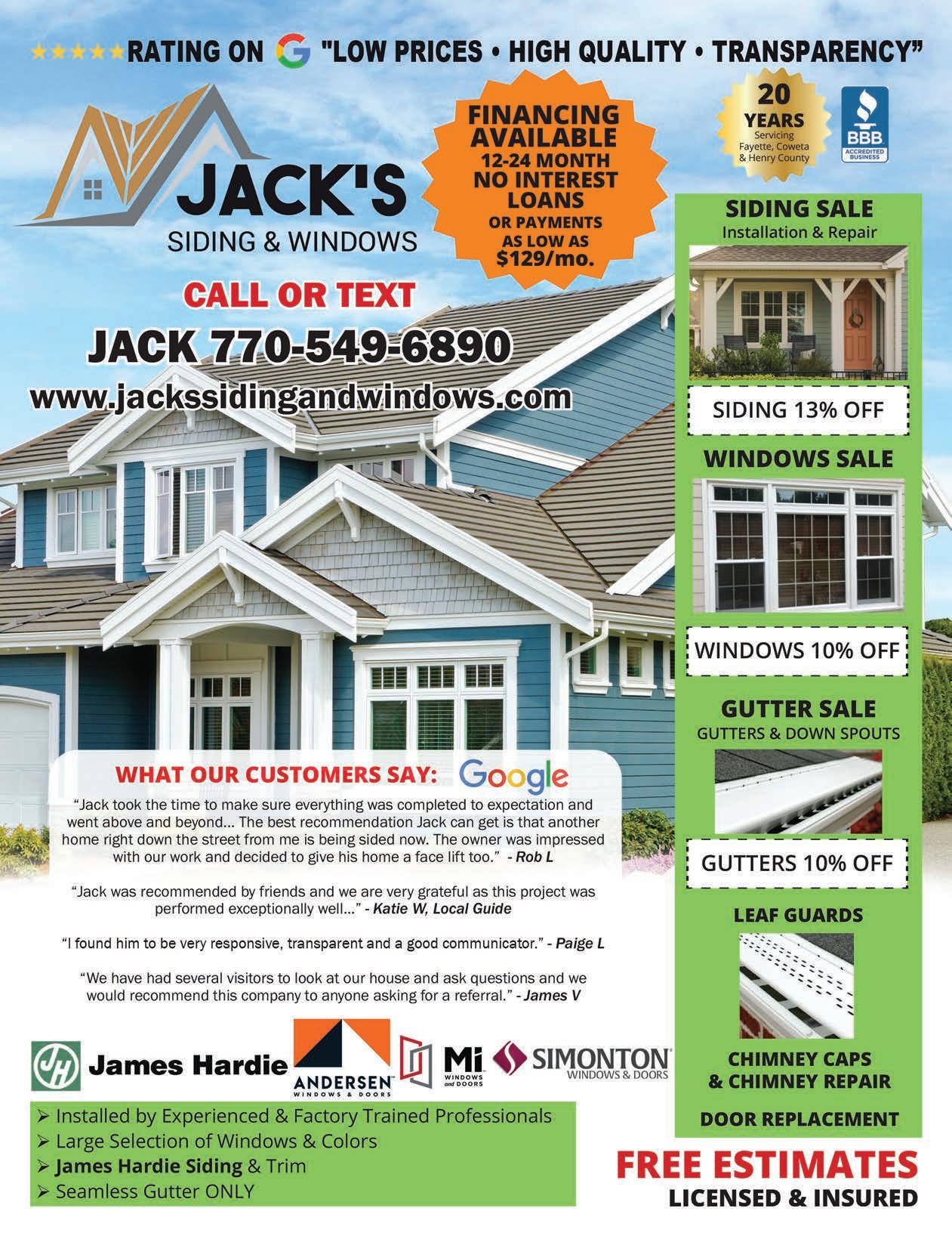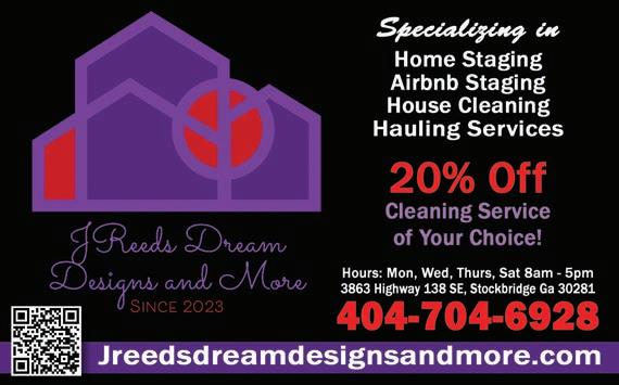 Extra Magazines can be picked up at the McDonough Welcome Center Licensed & Insured Senior Citizen Discounts References Available Upon Request SERVICES INCLUDE: • KITCHENS & BATHS • SIDING • FLOORING • DECKS (From basic to not-so-basic) • PORCHES • COVERED PORCHES • PATIOS • ELECTRICAL • PLUMBING AND MORE! FROM CONCEPT TO CREATION Let your dreams be our project. NOAH DIXON 470.687.8576 noahgrayson73@icloud.com DIXON HOME RENOVATIONS www.facebook.com/AirComfortDesigns • AIRCOMFORTDESIGNS.NET GLOBAL PLASMA SOLUTIONS MILITARY, FIRST RESPONDERS AND SENIOR DISCOUNTS 36 - 60 MONTHLY FINANCING • NO INTEREST* Improving indoor air quality helps identify hidden pollutants in your home AIR COMFORT DESIGNS, LLC. Heating and Air Stockbridge, GA 30281 678-300-8311 35 Years Experience Licensed and Insured Credit Cards Accepted DUCT CLEANING *Must ask Representative about Details & Qualifying Systems Purchase Cannot be combined with other offers. Offer expires 8/31/23. Cannot be combined with other offers. Offer expires 8/31/23. AIR COMFORT DESIGNS, LLC. Heating and Air AIR COMFORT DESIGNS, LLC. Heating and Air $250 off complete system replacement $100 off unit replacement NO CREDIT? BAD CREDIT? NEW Fast & Easy Lease Purchase Options