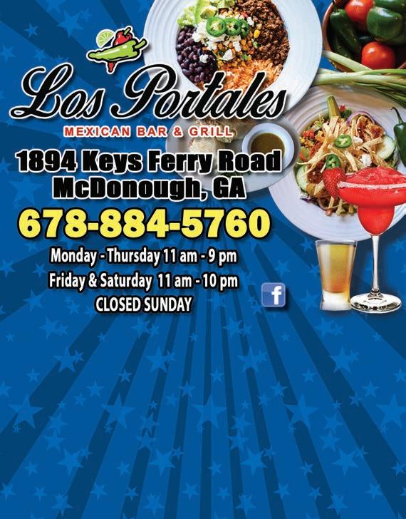 Events Extra Magazines can be picked up at the McDonough Welcome Center Food & Dining 3 LOCATION 40 Sims St | McDonough, GA 30253 CONTACT US (770) 957-2539 HOURS Sun & Mon Closed Tues - Sat 11:00 am - 7:00 pm www.PippinsBBQtogo.com Pippin’s BBQ and Catering THE OLDEST BBQ RESTAURANT (AND BEST) IN HENRY COUNTY! ESTABLISHED IN 1986 Featuring BBQ Pork, Chicken, Beef Brisket, Ribs, Hot Dogs, Salads, Sides & Desserts FREE SWEET TEA WITH THE PURCHASE OF ANY PLATE Cannot be combined with other offers. Expires 8-31-23 ORDER ONLINE EVERY TUESDAY LAW ENFORCEMENT APPRECIATION DAY LUNCH SPECIAL 11-2PM 15% OFF LUNCH SPECIAL 11-2PM 15% OFF EVERY WEDNESDAY CITY/COUNTY EMPLOYEE APPRECIATION DAY Must present ID. Must present ID.