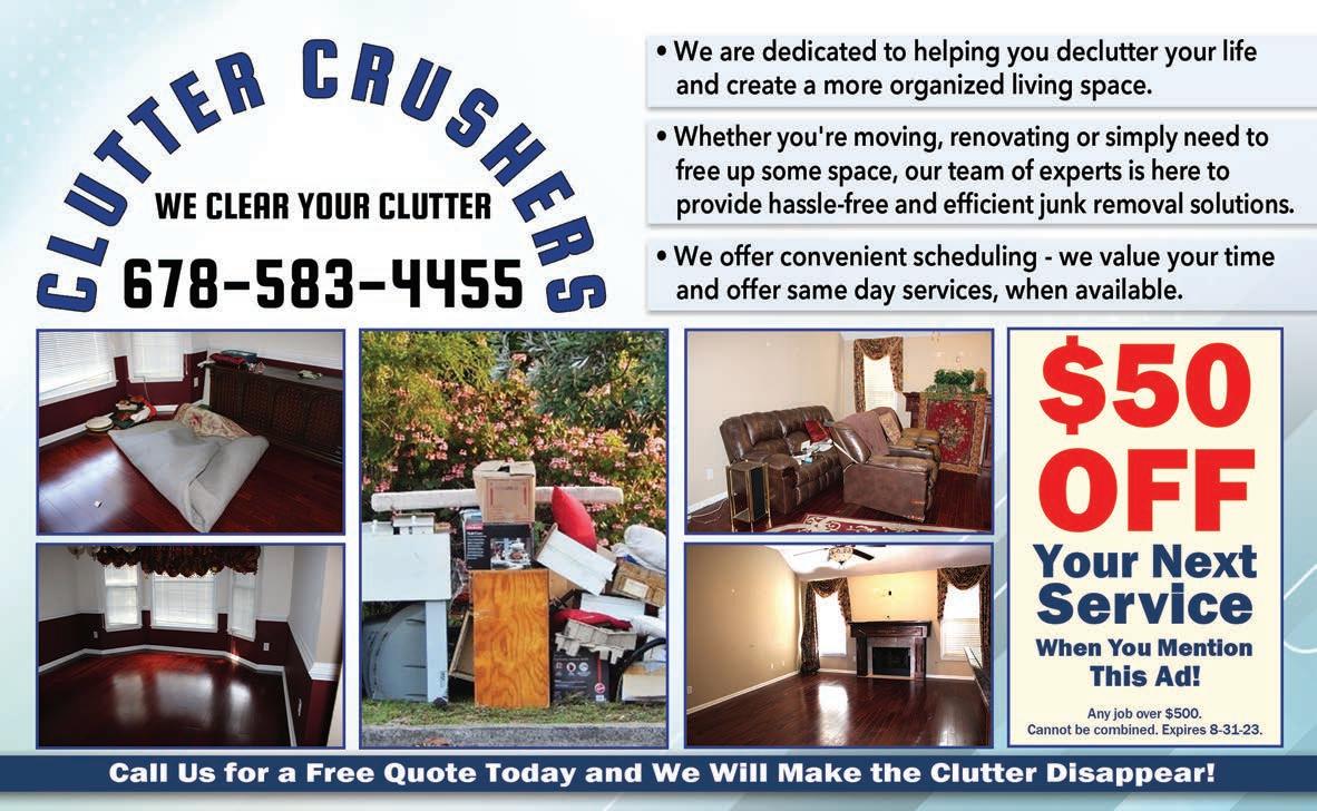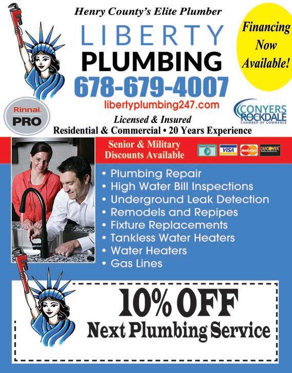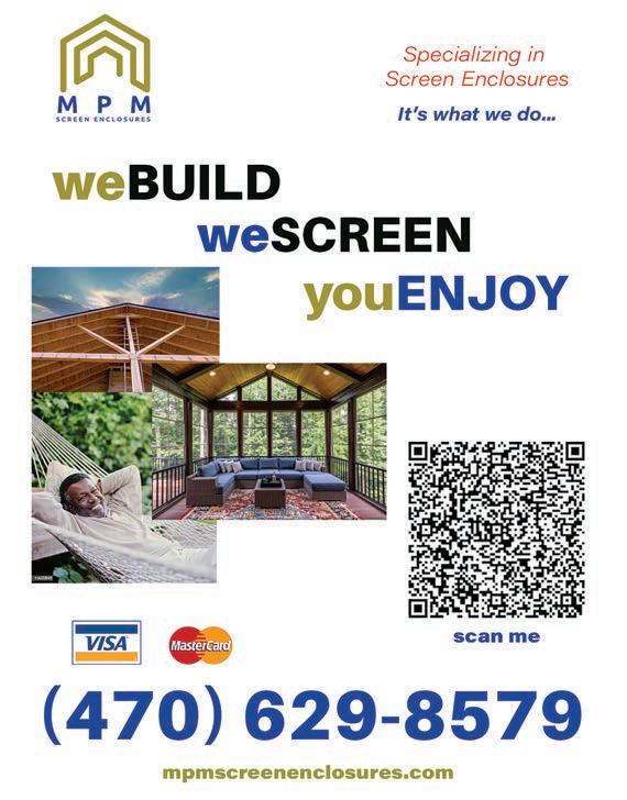 Extra Magazines can be picked up at the McDonough Welcome Center Lawn & Yard 65 $500.00 off a full roof Replacement or new 5” gutters (gutters only) Customers’ Choice Restoration Water, Mold, Fire & Smoke Painting • Roofing • Gutters • Tile • Siding Concrete • Drywall • Storm Damage and More! INTERIOR & EXTERIOR LICENSED & INSURED OFFICE: 678-829-3954 TYLER ROONEY: 678-656-0486 WAYNE DONLEY: 404-668-0486 TrinityResAndConstruction@gmail.com Offer expires 8/31/23 FREE ESTIMATES! RAMSEY’S PROFESSIONAL GROUP LANDSCAPING • TREE REMOVAL PRESSURE WASHING • JUNK REMOVAL CLEANING SERVICES COMMERCIAL & RESIDENTIAL 770-743-2676 SERVING SOUTH ATLANTA We do it all! Ramsey’s Professional Group @RamseyProGroup www.RamseysProfessionalGroup.com Licensed • Insured • Locally Owned & Operated DEBIT jeffwhisnantplumbing@gmail.com • Water Heater Replacement • Sewer & Drain Service • Water Line Replacement • Handicap Fixtures Installed • All Types Repairs & New Installations 770.616.5523 Senior & Military Discounts Available