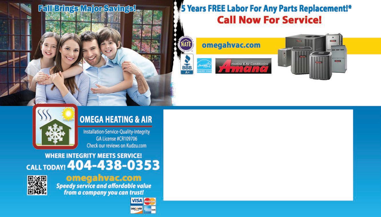 0% FINANCING FOR 60 MONTHS ON QUALIFYING SYSTEMS! Free Service Call With Repair for Seniors (60 and older), Military, Teachers and First Responders $500 VISA CARD MANUFACTURERS REBATE* *ON SELECT SYSTEMS FREE FREON WITH REPAIRS “We are praying for all families affected by Covid-19” OMEGA HEATING & AIR 404-438-0353 Must present coupon when receiving estimate. Cannot be combined with other coupons. Offer expires 11/30/23. COMPLETE 2 TON AC & HEAT REPLACEMENT 2 TON AIR-CONDITION UNIT WITH MATCHING COIL AND FURNACE $3790.00 OMEGA HEATING & AIR 404-438-0353 Must present coupon when receiving estimate. Cannot be combined with other coupons. Offer expires 11/30/23. OMEGA HEATING & AIR 404-438-0353 Must present coupon when receiving estimate. Cannot be combined with other coupons. Offer expires 11/30/23. WANT PEACE OF MIND: 10 YEAR PARTS WARRANTY, 5 YEAR LABOR WARRANTY, LIFETIME WARRANTY ON ANY NEW HIGH EFFICIENCY UNIT 10% DISCOUNT FOR ALL REPAIR WORK $139.00PER MONTH $99.00PER MONTH WITH PURCHASE OF HIGH EFFICIENCY AIR-CONDITION UNIT FREE FURNACE STARTING AT STARTING AT STARTING AT *System maintenance required. October & November 2023 Only. Call for Details. OMEGA HEATING & AIR • 404-438-0353 OMEGA HEATING & AIR 404-438-0353 Must present coupon when receiving estimate. Cannot be combined with other coupons. Offer expires 11/30/23. $69.95 HEAT TUNE UP AND SAFETY INSPECTION WITH FREE 1” PLEATED AIR-FILTER FREE WARRANTY 90 DAY WARRANTY & FREE DIAGNOSTIC CALL AFTER TUNE-UP PER UNIT 3 Rooms for Couch & Loveseat Deep Clean Using CRB Technology Each Additional Room Tile & Grout Cleaning Steam & Deodorize Each Additional Room $150 $175 $ 1.00 $25 $25 Only Sq. Ft. With coupon. Not valid with other offers. Expires 11-30-23. TSN With coupon. Not valid with other offers. Expires 11-30-23. TSN With coupon. Not valid with other offers. Expires 11-30-23. TSN With coupon. Not valid with other offers. Expires 11-30-23. TSN With coupon. Not valid with other offers. Expires 11-30-23. TSN
