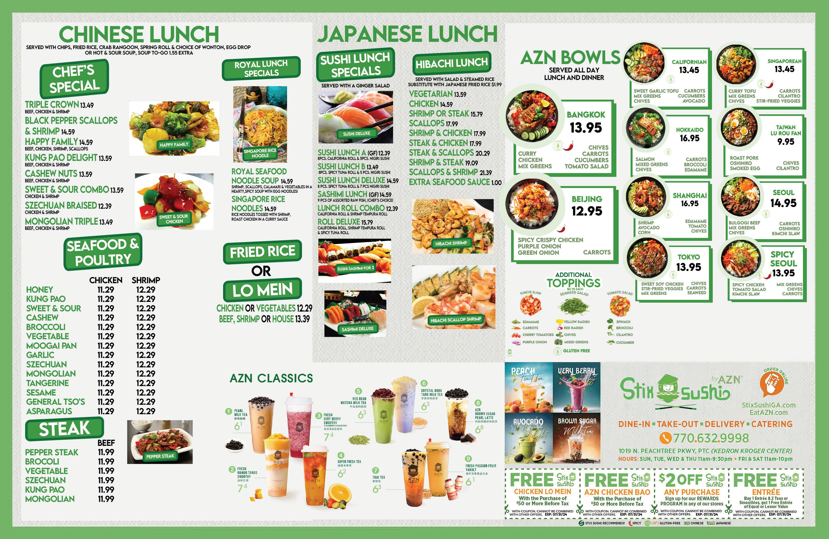 DINE-IN • TAKE OUT 770-487-9982 Lunch: Mon - Fri 11:00am-3:00pm • Sat & Sun 11:00am-3:00pm Dinner: Sun - Thurs 3:00pm-9:30pm • Fri - Sat 3:00pm-10:00pm ONLINE ORDERING AT GREENGINGERPTC.COM LARGE PRIVATE ROOM (SEATS UP TO 40) LARGE OUTDOOR PATIO Walnut Shrimp Shrimp Lo Mein Godzilla Roll With this coupon. Excludes Alcohol, Lunch Specials, Course Meals, Holidays, and any other specials. Coupon limited to one per table and before taxes. Not Valid with other offers. Expires 5/31/24. TSN 770-487-9982 with purchase of $40 or more Dine-In or Pick-Up FREE Crab Rangoon (6pc) or Tempura Cheesecake (1pc) With this coupon. Excludes Alcohol, Lunch Specials, Course Meals, Holidays, and any other specials. Coupon limited to one per table and before taxes. Not Valid with other offers. Expires 5/31/24. TSN 770-487-9982 your purchase of $70 or more DINE-IN ONLY. $10 OFF Lunch Sushi & Sashimi Thai Basil Roll PEACHTREE CITY FULL BAR Seats up to 40 Featuring Chinese, Thai, Japanese & Full Sushi Bar, Upscale Casual Dining Hibachi Steak and Lobster 200 MARKET PLACE CONNECTOR Peachtree City Come meet Lucki!