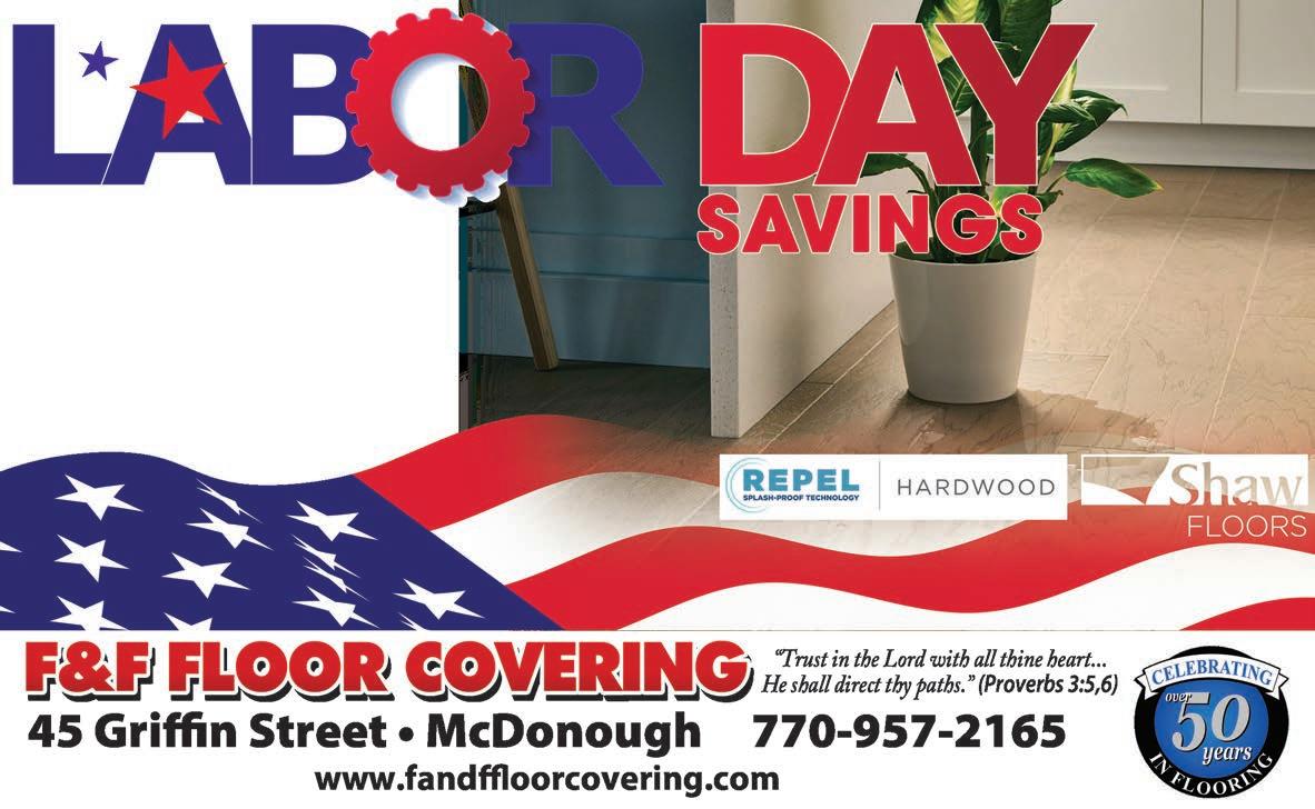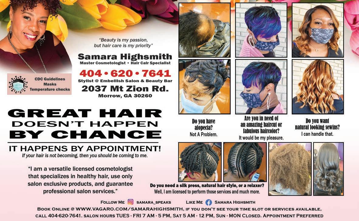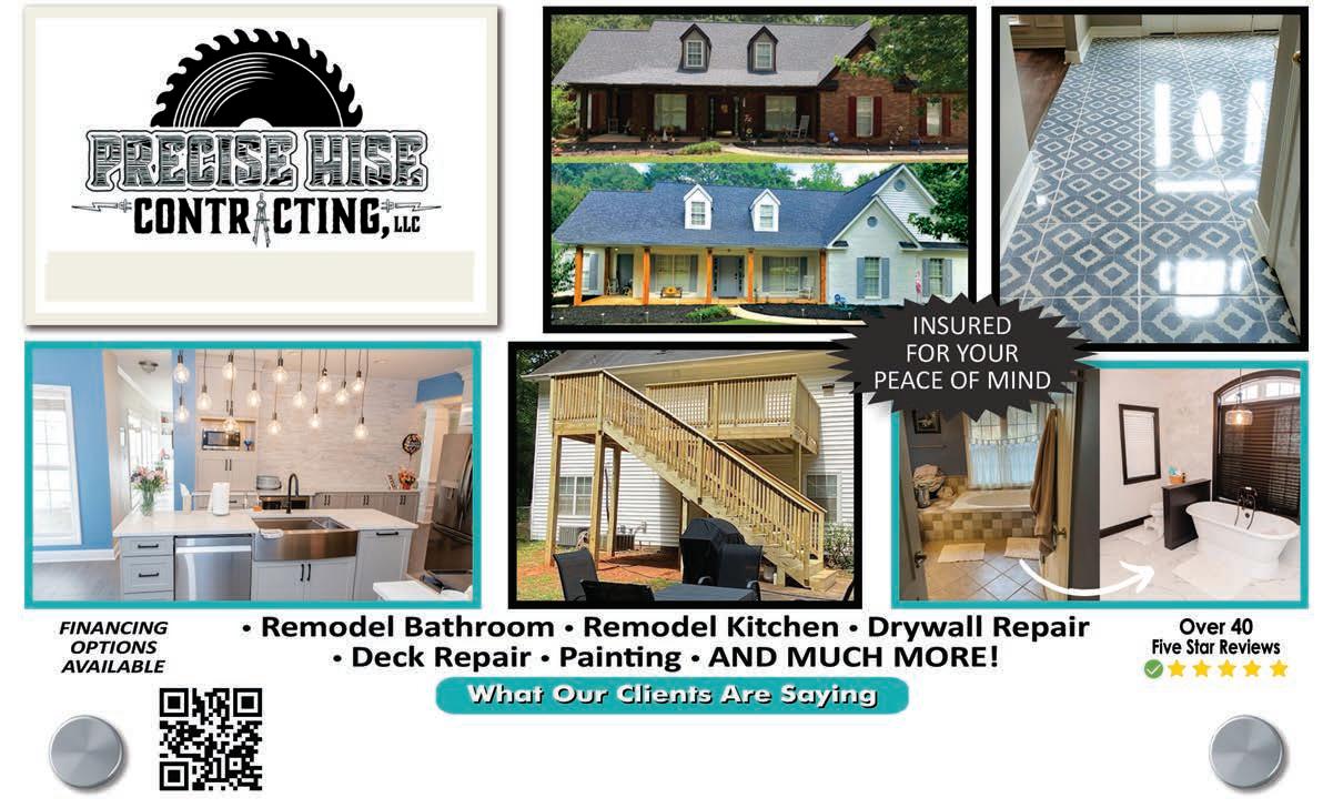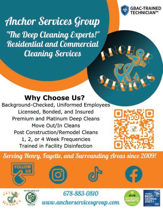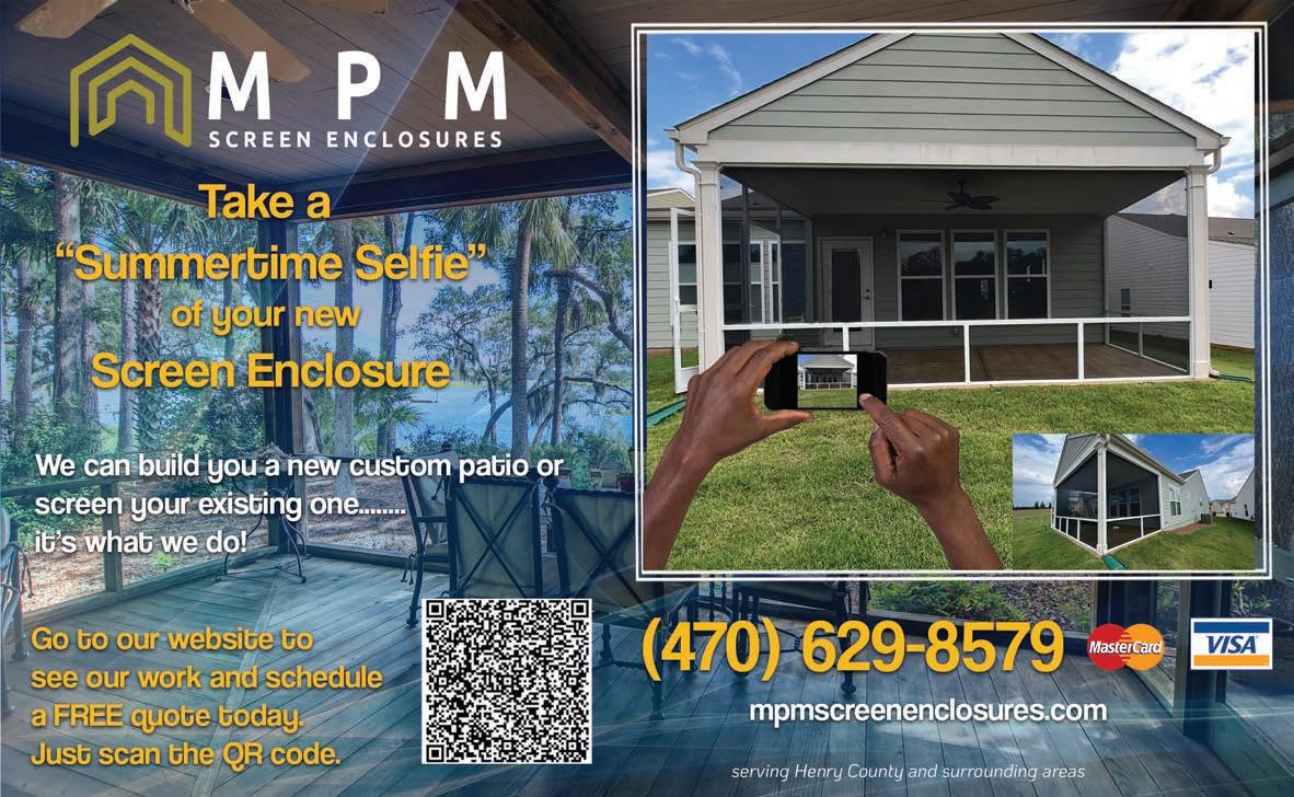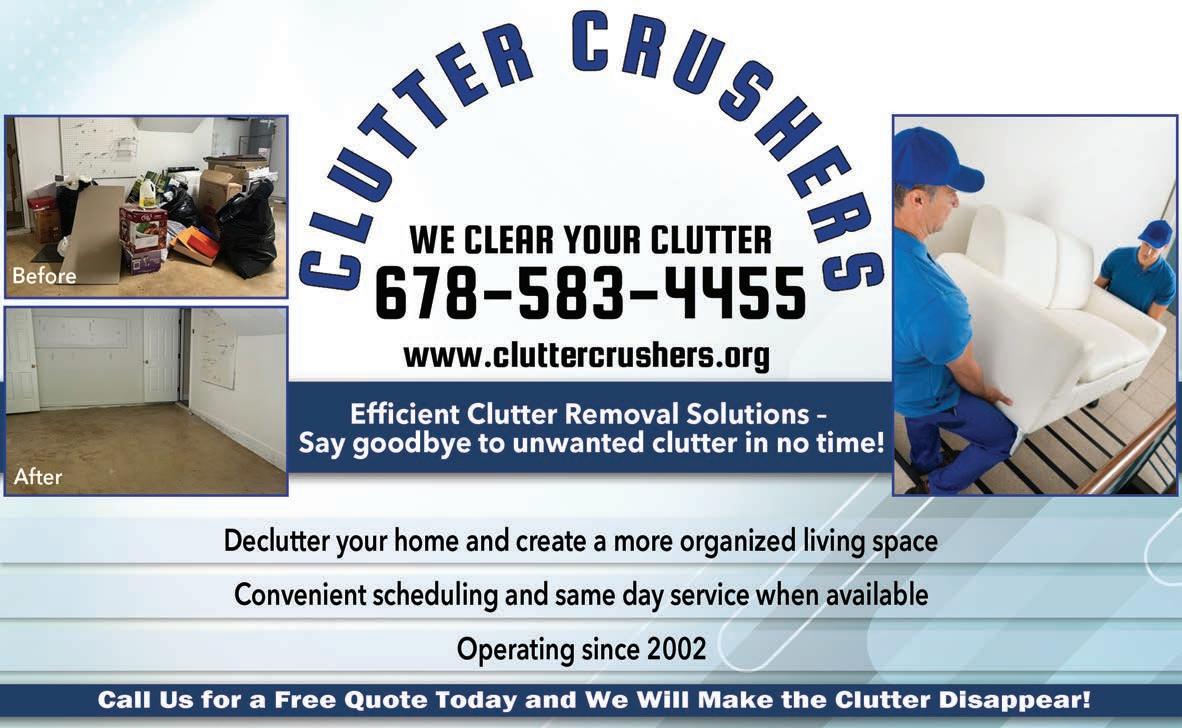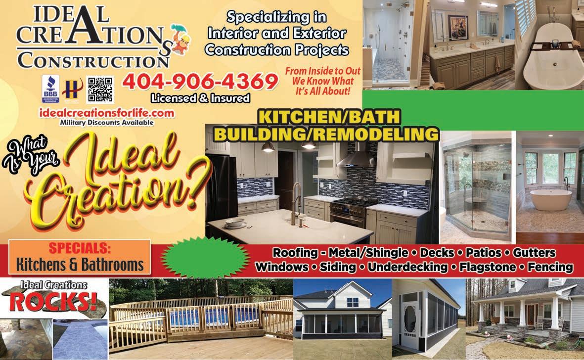 Extra Magazines can be picked up at the McDonough Welcome Center Home Ser vices 49 Licensed & Insured Senior Citizen Discounts References Available Upon Request SERVICES INCLUDE: • KITCHENS & BATHS • SIDING • FLOORING • DECKS (From basic to not-so-basic) • PORCHES • COVERED PORCHES • PATIOS • ELECTRICAL • PLUMBING AND MORE! FROM CONCEPT TO CREATION Let your dreams be our project. NOAH DIXON 470.687.8576 noahgrayson73@icloud.com DIXON HOME RENOVATIONS We clean Homes, Businesses, and do Post-Construction clean up! 404-395-2774 Email: TandKCleaningservice@yahoo.com Call for FREE estimate! Residential, and Commercial Cleaning Licensed, Bonded, and Insured Weekly, Bi-weekly, Monthly, As needed!