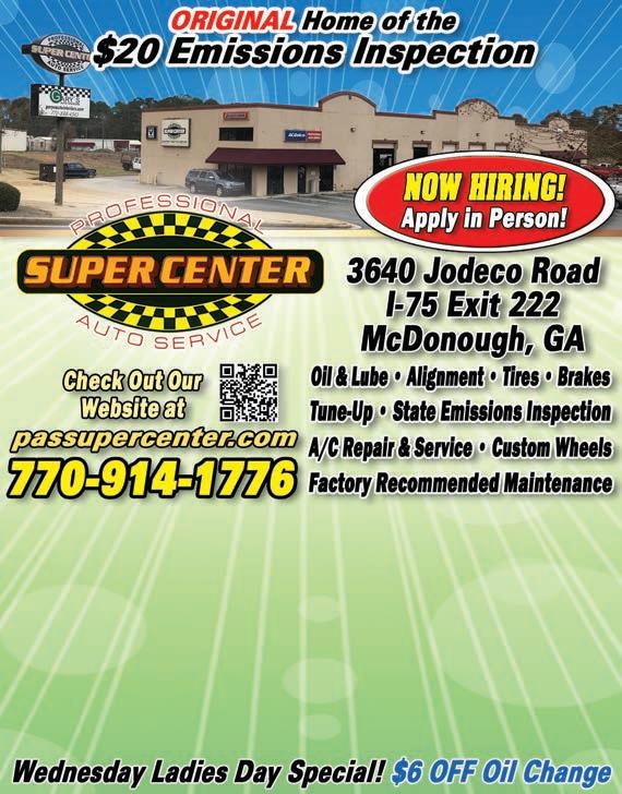 18 Automotive To Advertise, call (770) 954-1983 / 954-1984 or Visit our website www.TheShopper.net Beauty & Health NOW OFFERING 1234YF AC SERVICE! OIL CHANGE $2695 TheShopper.net TheShopper.net DISC BRAKE SPECIAL Standard Pads, turn rotors, anti-seize all moving parts. Most cars. 1 year or 12,000 miles. Must Present Coupon. Offer expires 10/31/23. $12995 TheShopper.net $20 OFF ANY FULL SERVICE REPAIR OF $200 OR MORE Must Present Coupon. Cannot combine offers. MOST CARS & TRUCKS. Offer expires 10/31/23. FREE AC CHECK Must Present Coupon. Cannot combine offers. MOST CARS & TRUCKS. Offer expires 10/31/23. TheShopper.net TheShopper.net TheShopper.net IMPROVE YOUR GAS MILEAGE! $23995 DUALS STARTING AT FREE CHECK ENGINE LIGHT CODE READING FULL SERVICE Must Present Coupon. MOST CARS & TRUCKS. Offer expires 10/31/23. TRUCKS & SUVS Must Present Coupon. Offer expires 10/31/23. 439 Hwy 81 E McDonough GA 30252 Hours: Mon-Fri: 8am-6pm Sat: 8am-3pm • Sun: Closed 10% OFF A SET OF NEW TIRES Cannot be combined with other offers. Expires 10/31/23. FREE ROTATION WITH PURCHASE OF A NEW SET Cannot be combined with other offers. Expires 10/31/23.