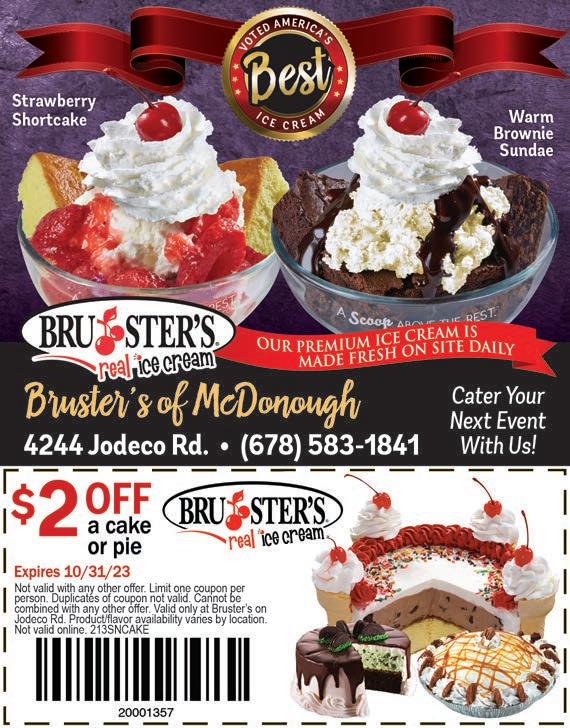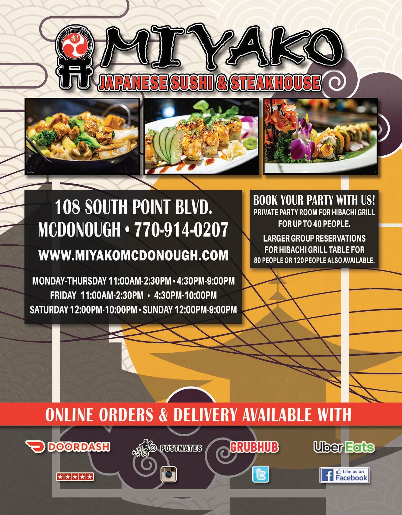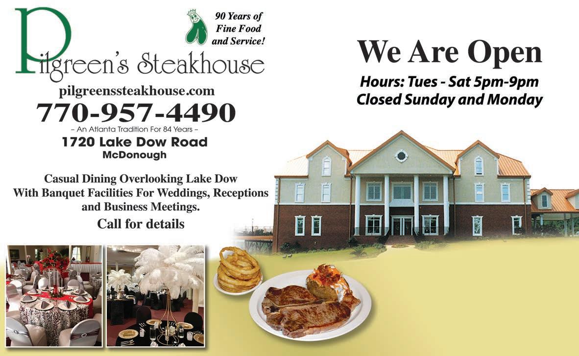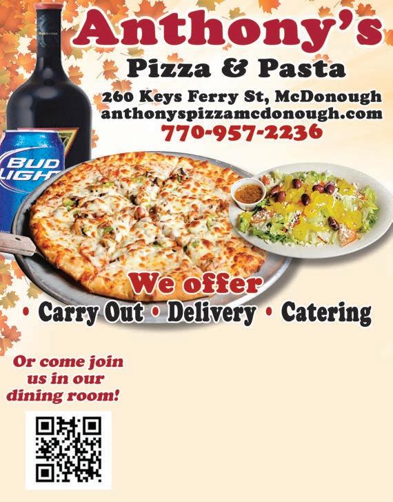 Extra Magazines can be picked up at the McDonough Welcome Center Food & Dining 7 LOCATION 40 Sims St | McDonough, GA 30253 CONTACT US (770) 957-2539 HOURS Sun & Mon Closed Tues - Sat 11:00 am - 7:00 pm www.PippinsBBQtogo.com Pippin’s BBQ and Catering THE OLDEST BBQ RESTAURANT (AND BEST) IN HENRY COUNTY! ESTABLISHED IN 1986 Featuring BBQ Pork, Chicken, Beef Brisket, Ribs, Hot Dogs, Salads, Sides & Desserts FREE SWEET TEA WITH THE PURCHASE OF ANY PLATE Cannot be combined with other offers. Expires 10-31-23 ORDER ONLINE EVERY TUESDAY LAW ENFORCEMENT APPRECIATION DAY LUNCH SPECIAL 11-2PM 15% OFF LUNCH SPECIAL 11-2PM 15% OFF EVERY WEDNESDAY CITY/COUNTY EMPLOYEE APPRECIATION DAY Must present ID. Must present ID. AUTHENTIC & DELICIOUS THAI CUISINE AUTHENTIC & DELICIOUS THAI CUISINE Pad Thai with Shrimp OPEN FOR: LUNCH & DINNER Highly Experienced Chefs & Bakers Large Variety of Entrees & Desserts Freshly Prepared To Order. Cheesecake Thai Custard with Sticky Rice Thai Cashew Chicken Sesame Chicken Potak Seafood Soup Sticky Rice Mango Basil Duck Orange Chicken Curry Puff Grilled Salmon Grilled Salmon Mon-Thurs: Lunch: 11am-3pm. • Dinner: 4:30pm-9pm Fri.: Lunch: 11am-3pm • Dinner: 4:30pm-10pm Sat.: Lunch & Dinner 12pm-10pm Sun.: Lunch: 12pm-3pm • Dinner: 4:30pm-9pm 622 Eagles Landing Parkway Stockbridge, GA 30281 770.507.8887 www.InseeThaiCuisine.magix.net Lart Nar Red Snapper w/Three Flavours Sauce Shrimp Roll $5 OFF Your total purchase of $30 or more Cannot be combined with other offers. Offer Expires 10/31/23. Steamed Dumpling