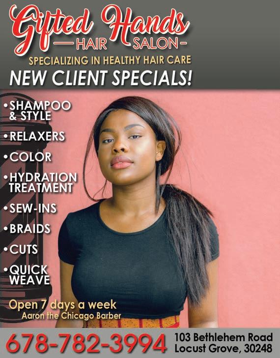 Experience the Difference Ask Me About AFFORDABLE Health Insurance 678-956-1181 GELonlineHealth.com Medicare • Health Insurance • Dental • Vision Coverage from Age 0-99 Are You Losing Your Medicaid? Let Us Assist You Serving Georgia & Beyond Gale Edwards Lawrence GELHealthAdvisors.com ETIENNE STRATEGIC MANAGEMENT CONSULTING THE SOLUTIONS REPOSITORY Research & Evidence-based Solutions Corporate Performance Analysis Resource Usage Optimization Industry Best Practices www.etiennestrategicmc.com Visit Our Website CORNER STONE 2004 Eastview Pkwy, Ste 202 Conyers, GA 30013 David Etienne CPA, CA, MSc, PMP myebsolutions.com 678-400-2449 Take your operations to the next level with our comprehensive business consulting services.