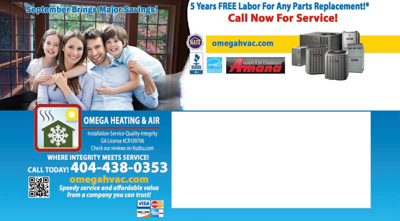 Extra Magazines can be picked up at the McDonough Welcome Center Home Ser vices 59 $100.00 OFF Full Interior or Exterior Paint Projects! Cannot be Combined With Other Offers. Limit 1 Per Person. Expires 10-31-23. 0% FINANCING FOR 60 MONTHS ON QUALIFYING SYSTEMS! ON Free Service Call With Repair for Seniors (60 and older), Military, Teachers and First Responders $500 VISA CARD MANUFACTURERS REBATE* *ON SELECT SYSTEMS FREE FREON WITH REPAIRS “We are praying for all families affected by Covid-19” OMEGA HEATING & AIR 404-438-0353 Must present coupon when receiving estimate. Cannot be combined with other coupons. Offer expires 10/31/23. COMPLETE 2 TON AC & HEAT REPLACEMENT 2 TON AIR-CONDITION UNIT WITH MATCHING COIL AND FURNACE $3790.00 OMEGA HEATING & AIR 404-438-0353 Must present coupon when receiving estimate. Cannot be combined with other coupons. Offer expires 10/31/23. OMEGA HEATING & AIR 404-438-0353 Must present coupon when receiving estimate. Cannot be combined with other coupons. Offer expires 10/31/23. WANT PEACE OF MIND: 10 YEAR PARTS WARRANTY, 5 YEAR LABOR WARRANTY, LIFETIME WARRANTY ON ANY NEW HIGH EFFICIENCY UNIT 10% DISCOUNT FOR ALL REPAIR WORK $139.00PER MONTH $99.00PER MONTH WITH PURCHASE OF HIGH EFFICIENCY AIR-CONDITION UNIT FREE FURNACE STARTING AT STARTING AT STARTING AT *System maintenance required. September & October 2023 Only. Call for Details. OMEGA HEATING & AIR • 404-438-0353 OMEGA HEATING & AIR 404-438-0353 Must present coupon when receiving estimate. Cannot be combined with other coupons. Offer expires 10/31/23. $69.95 AIR-CONDITION TUNE UP WITH FREE 1” PLEATED AIR-FILTER FREE WARRANTY 90 DAY WARRANTY & FREE DIAGNOSTIC CALL AFTER TUNE-UP PER UNIT