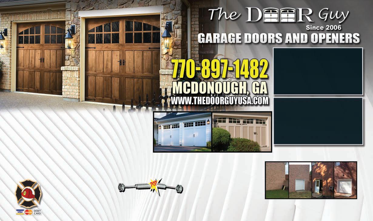Extra Magazines can be picked up at the McDonough Welcome Center Home Services 29 Cannot be combined with any other coupons or offers. Expires 10/31/23. FREE SERVICE CALL With Any Repair ASK US ABOUT OUR CARRIAGE DOOR SPECIALS! CALL TODAY! 770-897-1482 WE FIX BROKEN SPRINGS! ASK ABOUT OUR FREE ESTIMATES & SENIOR/MILITARY DISCOUNTS LICENSED & INSURED FIREMAN OWNED & OPERATED Your Garage and Entry Doors are Important Investments That Not Only Enhance the Look of Your Home, but Make it More Efficient! We Have The Perfect Design For You! Make Your Home More Efficient and Attractive! SALES, SERVICE, & INSTALLATION OF RESIDENTIAL GARAGE DOORS & OPENERS BEST PRICE GUARANTEE! It’s Not Just a Slogan PUT OUR TEAM TO WORK FOR YOU! Serving Atlanta for Over 60 Years FULLY INSURED! www.a1roof-remodeling.com www.a1roof-remodeling.com FREE HAIL OR STORM DAMAGE ESTIMATES AVAILABLE FREE HAIL OR STORM DAMAGE ESTIMATES AVAILABLE Call For A Quick & Complete Estimate! Office: 404-627-6909 CELL: 404-787-7001 ALL YOUR REMODELING NEEDS OR HOME REPAIRS Re-Roof Roof Repairs Tear Off Build-Up Modified Rubber Roofs Gutters Vinyl Siding Now Offering Home Energy Efficiency Service!