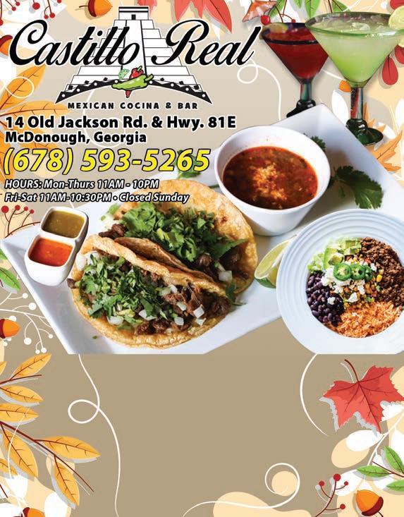 Extra Magazines can be picked up at the McDonough Welcome Center Food & Dining 13 Now Delivering with http://www.castillorealcocina.com ONLY VALID FOR DINE-IN ONLY. NOT VALID FRIDAY OR SATURDAY. DINNER ONLY. NOT VALID WITH ANY OTHER OFFER. MAX VALUE $8 Castillo Real Expires 10/31/23. ONLY VALID FOR DINE-IN ONLY. NOT VALID FRIDAY OR SATURDAY. NOT VALID WITH ANY OTHER OFFER. MAX VALUE $6 • Castillo Real • Expires 10/31/23. FREE DINNER ENTRÉE WITH PURCHASE OF ENTREE & 2 DRINKS FREE Cheese Dip WITH A PURCHASE OF $45 OR MORE $5 OFF TOTAL BILL OF $35 OR MORE DINE-IN ONLY. NOT VALID FRIDAY OR SATURDAY. LIMIT TWO COUPONS PER TABLE. NOT VALID WITH ANY OTHER OFFER. MAX VALUE $5 Castillo Real Expires 10/31/23