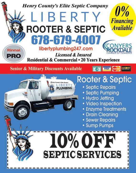 Extra Magazines can be picked up at the McDonough Welcome Center Home Ser vices 43 STOPPED UP? CALL US! Call Bill Elliott III 770-898-3761 www.elliotsseptictank.com • Septic Tanks & Grease Traps Pumped • Jet Services Available • Tees/Filters/Lid Replacements • Fieldline & Pump Replacements • Inspection Letters • Video Camera Inspections • Alternate Systems/Lift Stations • Septic Tank & Fieldline Treatments SENIOR’S DISCOUNT Elliott's Septic Tank & Grease Trap Service, Inc $15 OFF SEPTIC PUMPING FEE Must present this ad. Cannot be combined with other offers. Offer expires 10/31/23. RESIDENTIAL • COMMERCIAL • INDUSTRIAL Licensed • Bonded • Insured WE’RE #1 IN THE #2 BUSINESS!! 7 DAYS A WEEK EMERGENCY SERVICEHOLIDAYS INCLUDED