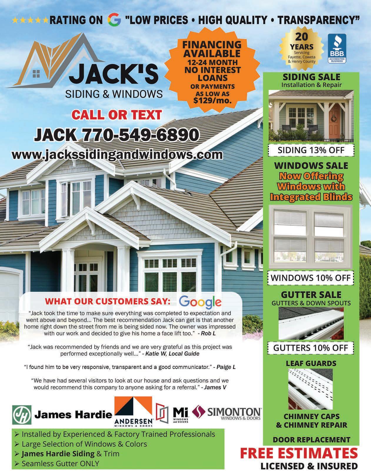 For information about advertising, call us at 770.954.1983/954.1984 13 678-544-9267 FREE GUTTER GUARDS WITH ROOF AND GUTTER PURCHASE Fully Insured FREE ESTIMATES | Located on: $1,000 OFF ROOF REPLACEMENT $6,999 OR MORE $250 OFF GUTTERS $1,500 OR MORE Offer expires 11/30/23. Offer expires 11/30/23. Specializing in New Roofing, Leak Repairs, Emergency Repairs, Gutters & more! PITCHPERFECTRG.COM Financing Available! Family Owned and Operated Fall Special Gutter Special