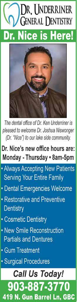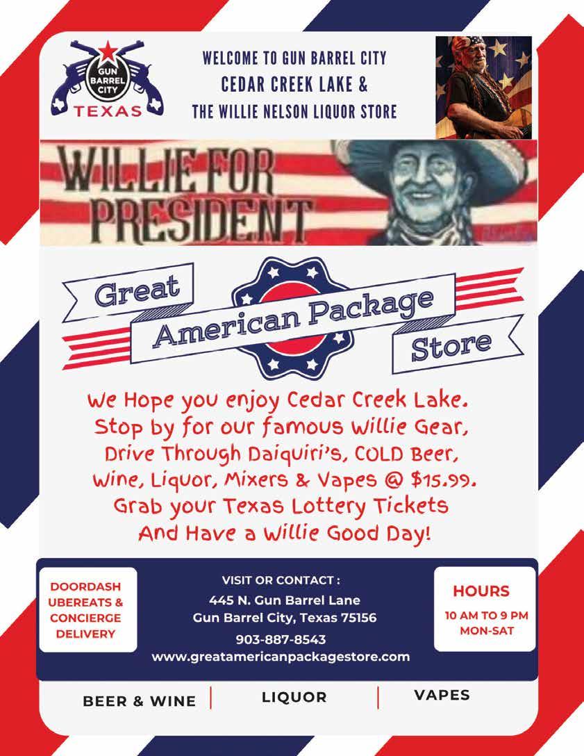 Community in 2009. Gun Barrel City holds two festivals each year, July Fest along with the Christmas Festival and Parade with another memorable fireworks display and/or drone show. With the city being 55 miles southeast of Dallas on the eastern shore of Cedar Creek Lake, Gun Barrel City has something to offer for everyone. The city has a large concentration of businesses that appeals to a variety of interests and serves many needs, including ETX Inject Cosmetics & Wellness, Nice Family Dentistry, Cedar Creek Cosmo (a wellness and beauty spa), Axe Nation and Wings Over USA. The great entertainment and wonderful restaurants aren’t the only reasons why thousands of visitors plan a trip to Gun Barrel City. Visitors also enjoy the fishing and recreation offered by Cedar Creek Lake. The city also has a terrific park that offers disc golf, horseshoe pits, a skate park, an amphitheater, exercise workstations, a fishing pond, walking trails and pickleball.