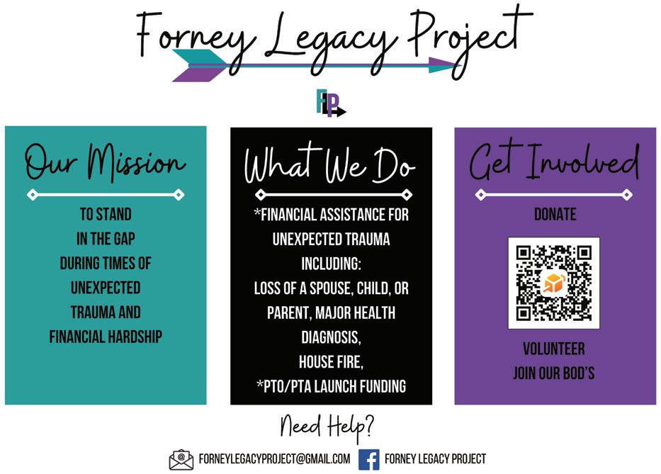 copy and ads, unless submitted by advertisers, in this publication are copyright of The Terrell Tribune. All rights reserved. No part of this publication may be reproduced in any form or by any process without written permission from The Terrell Tribune. Effort has been made to make this publication as complete and accurate as possible. All references contained in this publication have been compiled from sources believed to be reliable. The Forney Chamber Magazine and Membership Directory is an annual publication of The Forney Chamber of Commerce as a service to the Membership, newcomers and associates. The Membership listing is a listing of Terrell Chamber of Commerce Member as of Feb. 1, 2024. While every reasonable effort has been taken in the compilation and preparation of this publication, The Terrell Tribune assumes no liability resulting from any error or omission from this publication, or from the use of information contained herein. If a listing is in error, please call the Chamber at 972-564-2233.