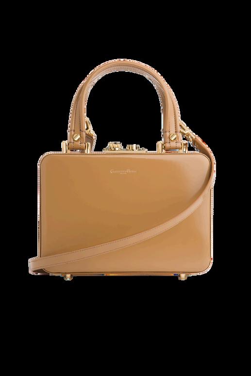 Curved edges provide a modern feel to its structured silhouette, enriched with a push lock clasp in gold metal and the embossed logo on the front Refined tone-on-tone stitching runs along the edges and on the two top handles. The crossbody strap is adjustable and removable.