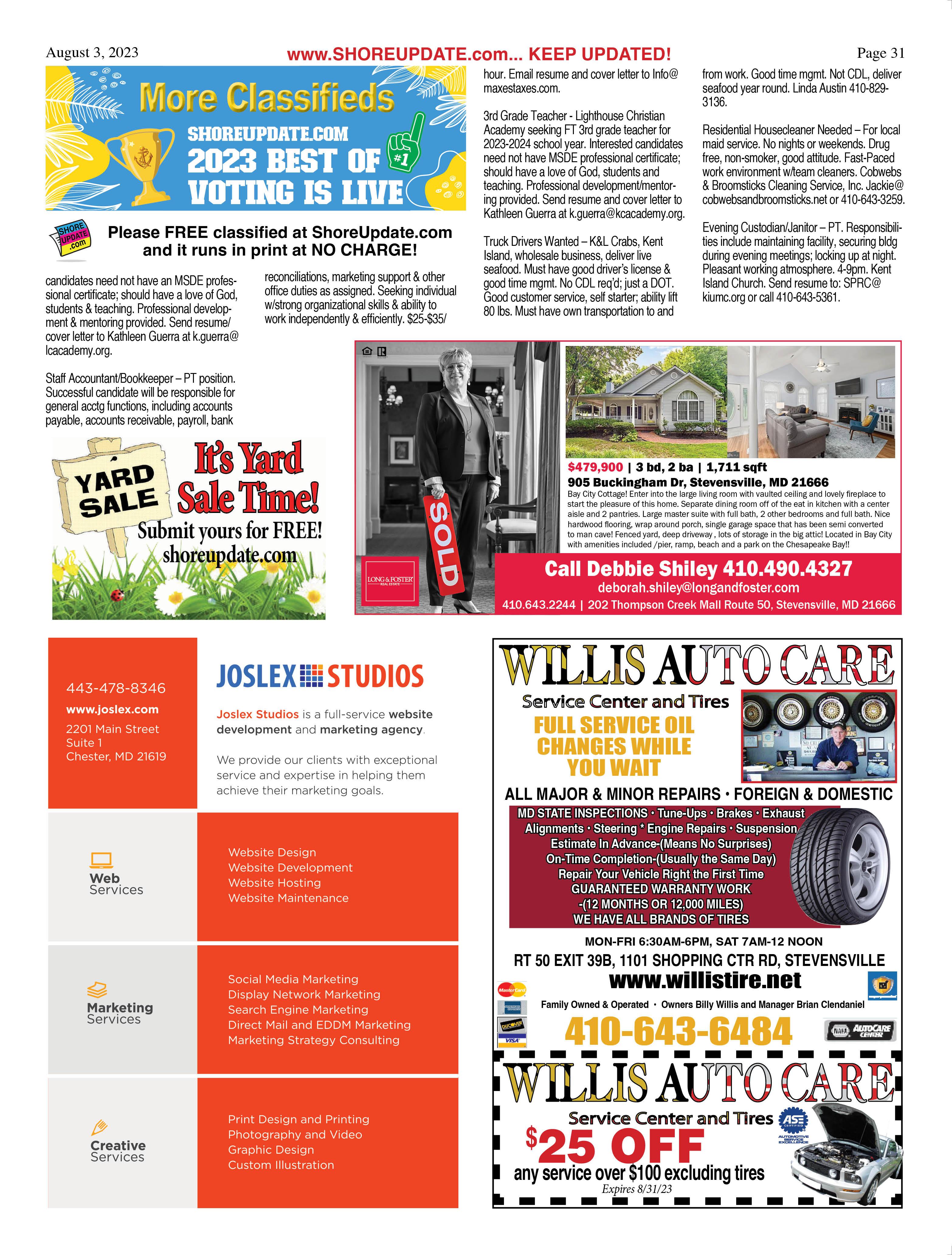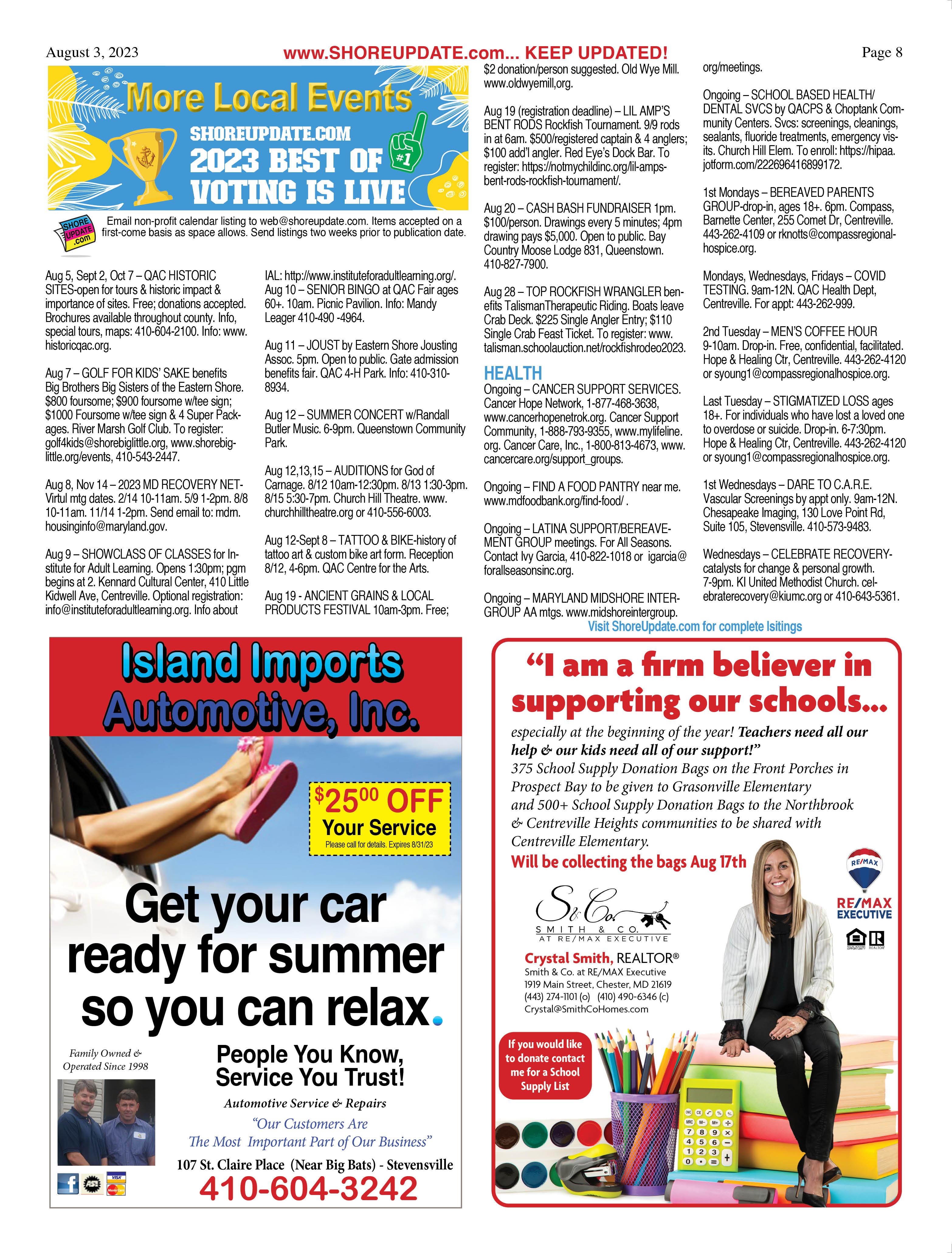 Thru Aug 10 – BACK TO SCHOOL DRIVE sponsored by QAC Chamber of Commerce. School supplies to benefit elem & middle school. Drop off: Mon-Thurs, 9am-3:30pm. 151 Postal Rd, Chester. Call or email when dropping off. Info: 410-643-8530 or tracy@ qacchamber.com.